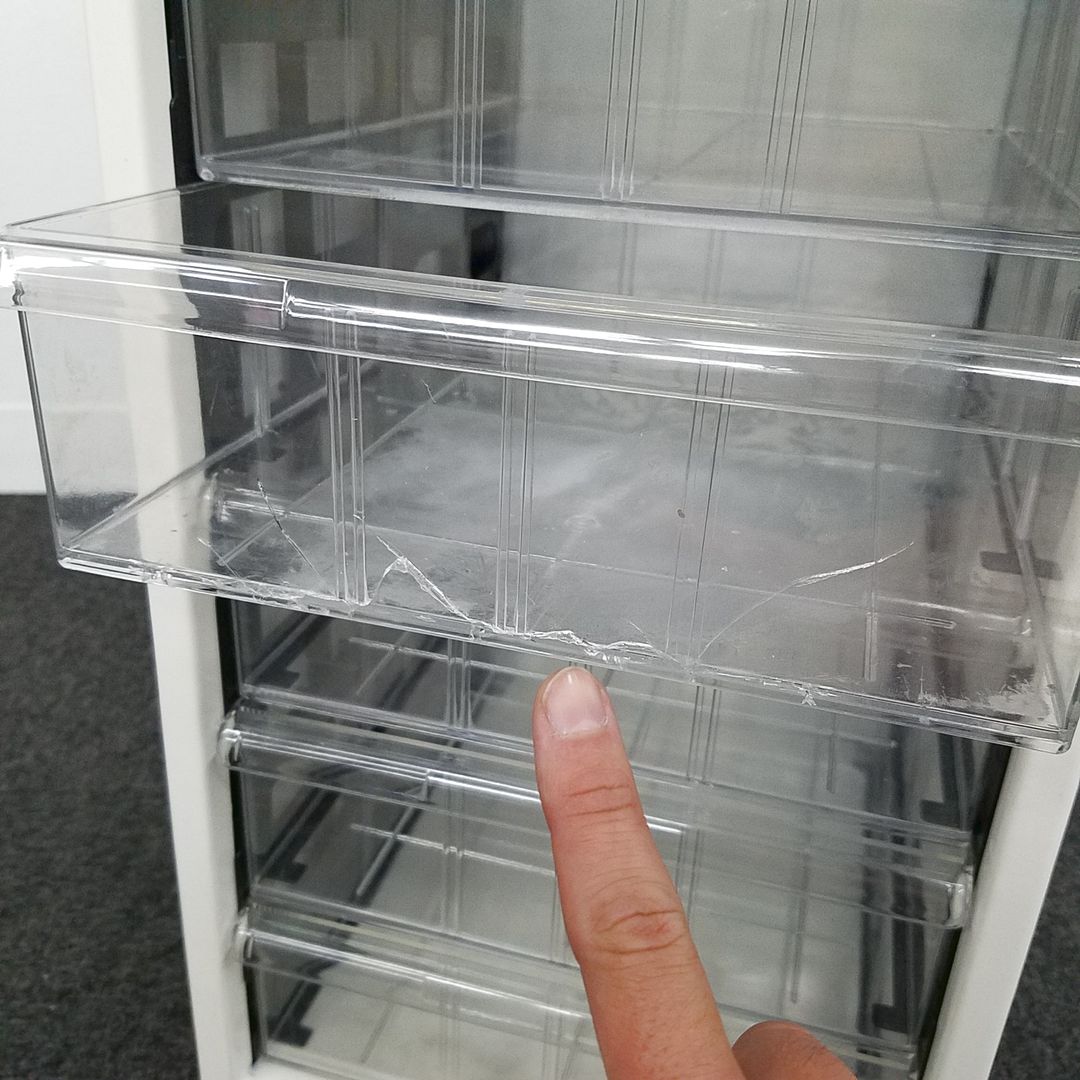 - 多数不具合あり引出の開閉不可、施錠不可、棚板無しといったその書庫の本来の効用を果たすための機能以外の多数が使用不可(例、扉、引出の開閉がしづらいなどがある。 )