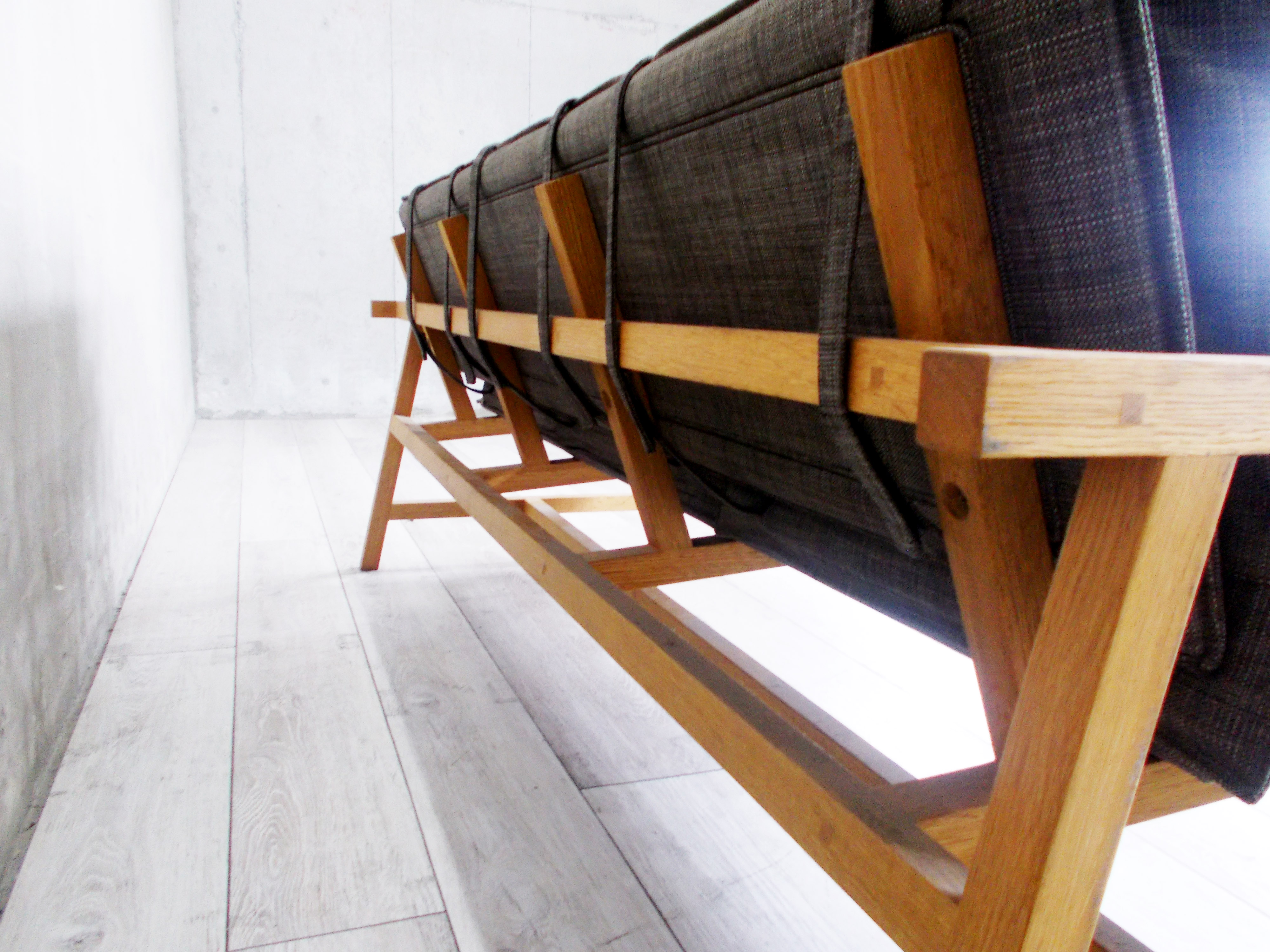 姿勢を正した、「規律ある暮らし」をイメージして制作されました。座ると自然に背筋が伸びやすく、少し固めの座り心地です。程良い硬さで長く座っていても疲れにくいベンチ型ソファです。