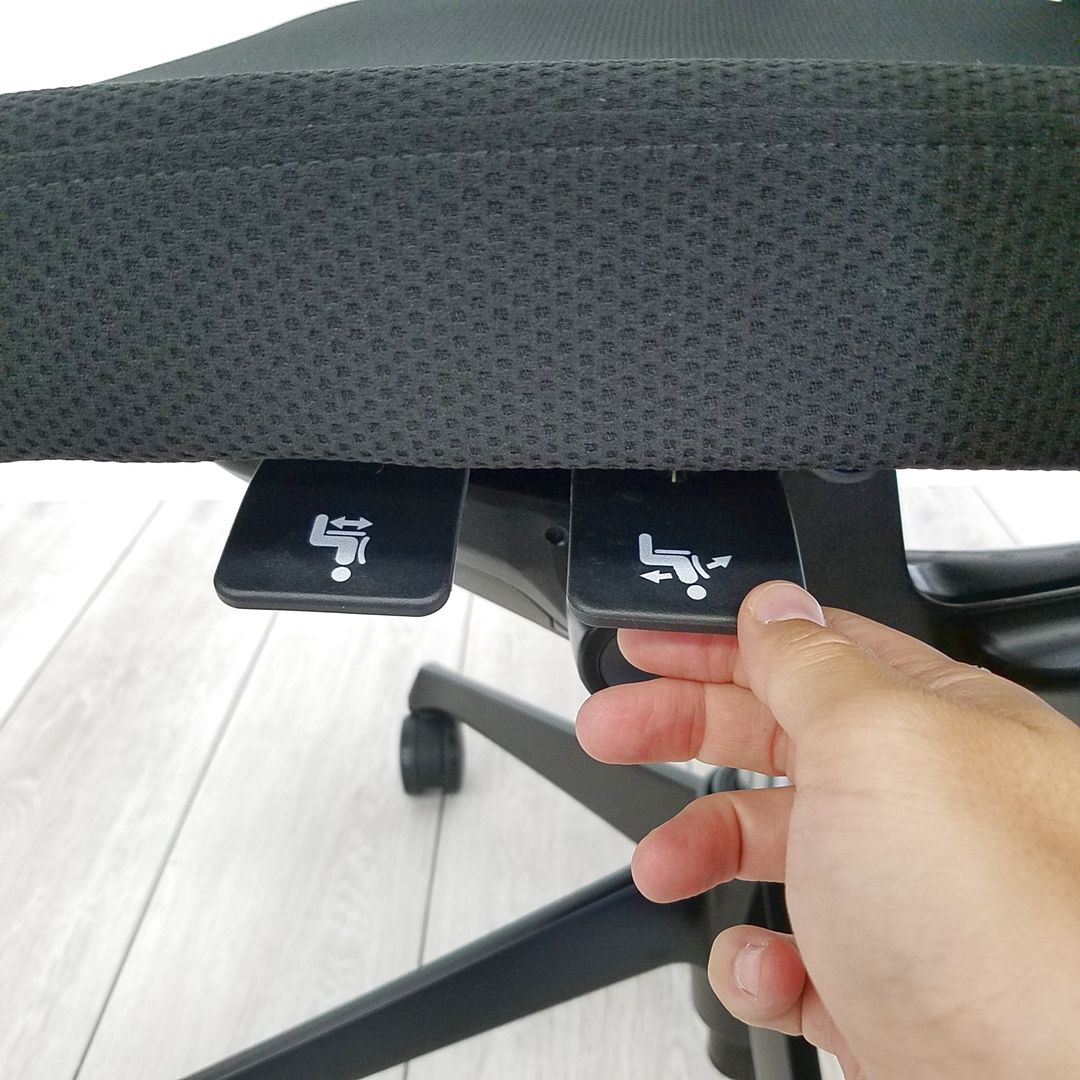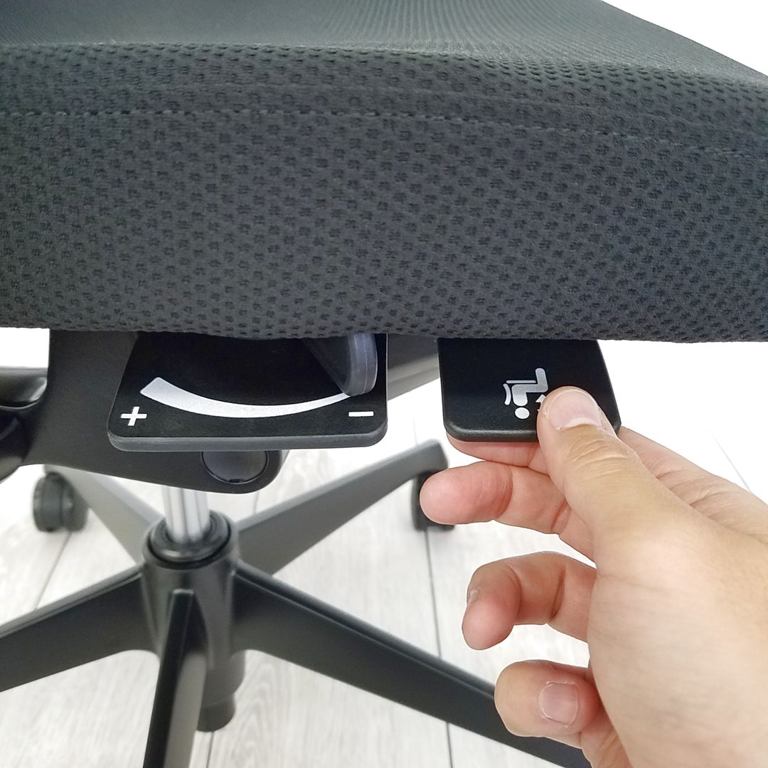座面の高さや前後などの基本的な調整レバーが座面裏の前方に集約されており、姿勢を変えずに調節ができます。