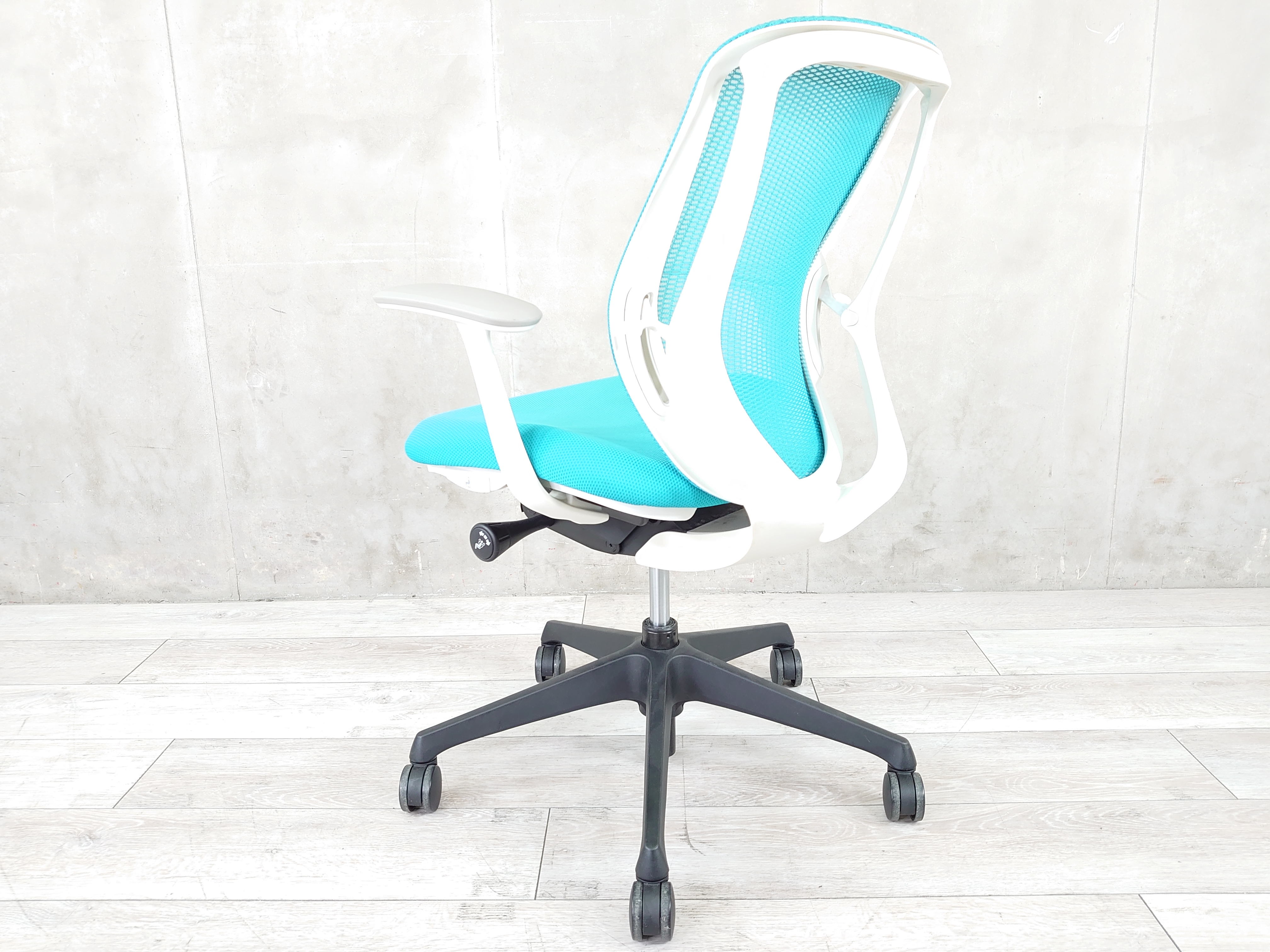 - 座面左下のダイヤルでリクライニングの固定と解除が行えます。 前傾ポジションをとることも可能です。
