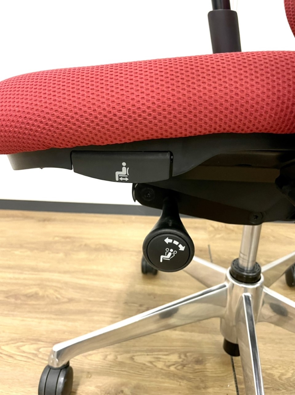 - 座面の左にあるレバー操作により、座面の奥行き調整が可能です。(ストローク:50mm)
