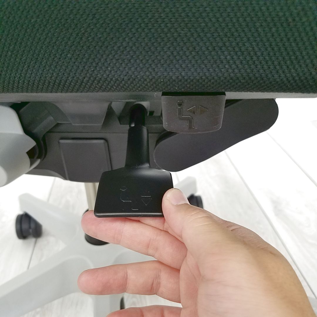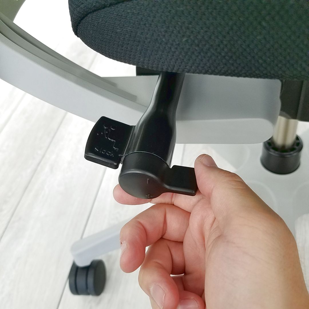 - 座面下のレバー操作により、座面を50mmのストローク(16.7mmピッチ)で好みの位置に調節できます。体格や作業姿勢に合わせたポジション設定が行えます。