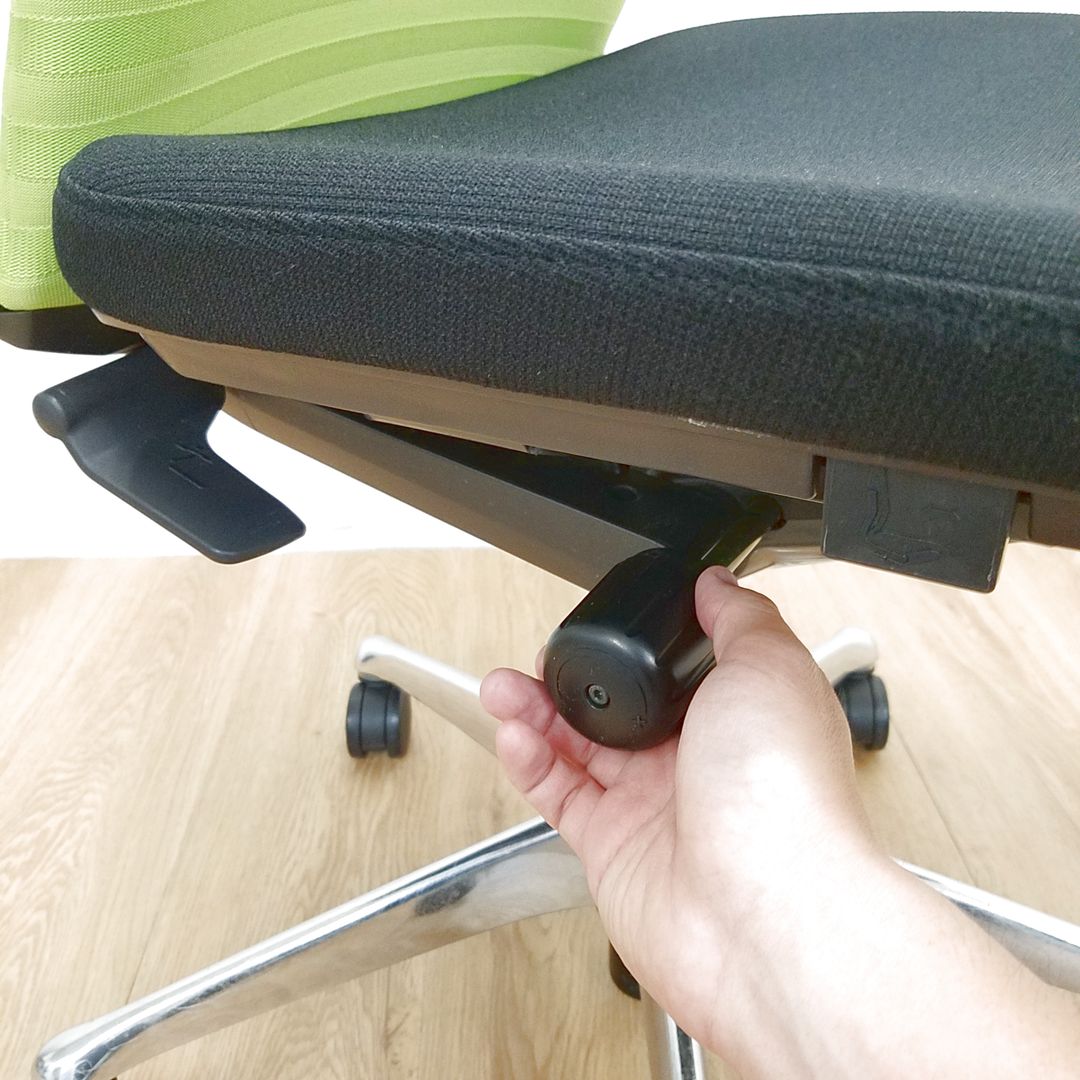 - 深く座りたい人、浅く座りたい人など利用者にあった形で座面が前後45mm範囲で調節できるので、腰の負担を軽減します。