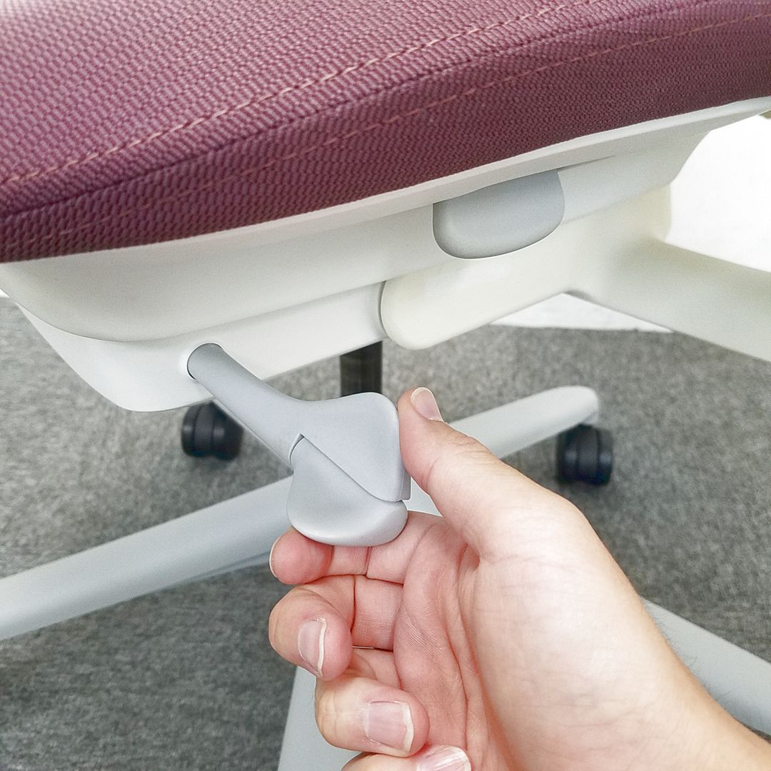 - 座ったまま、レバー操作一つで、簡単に座面を前傾できます。前傾姿勢を取ることが多いデスクワーカーに最適です。