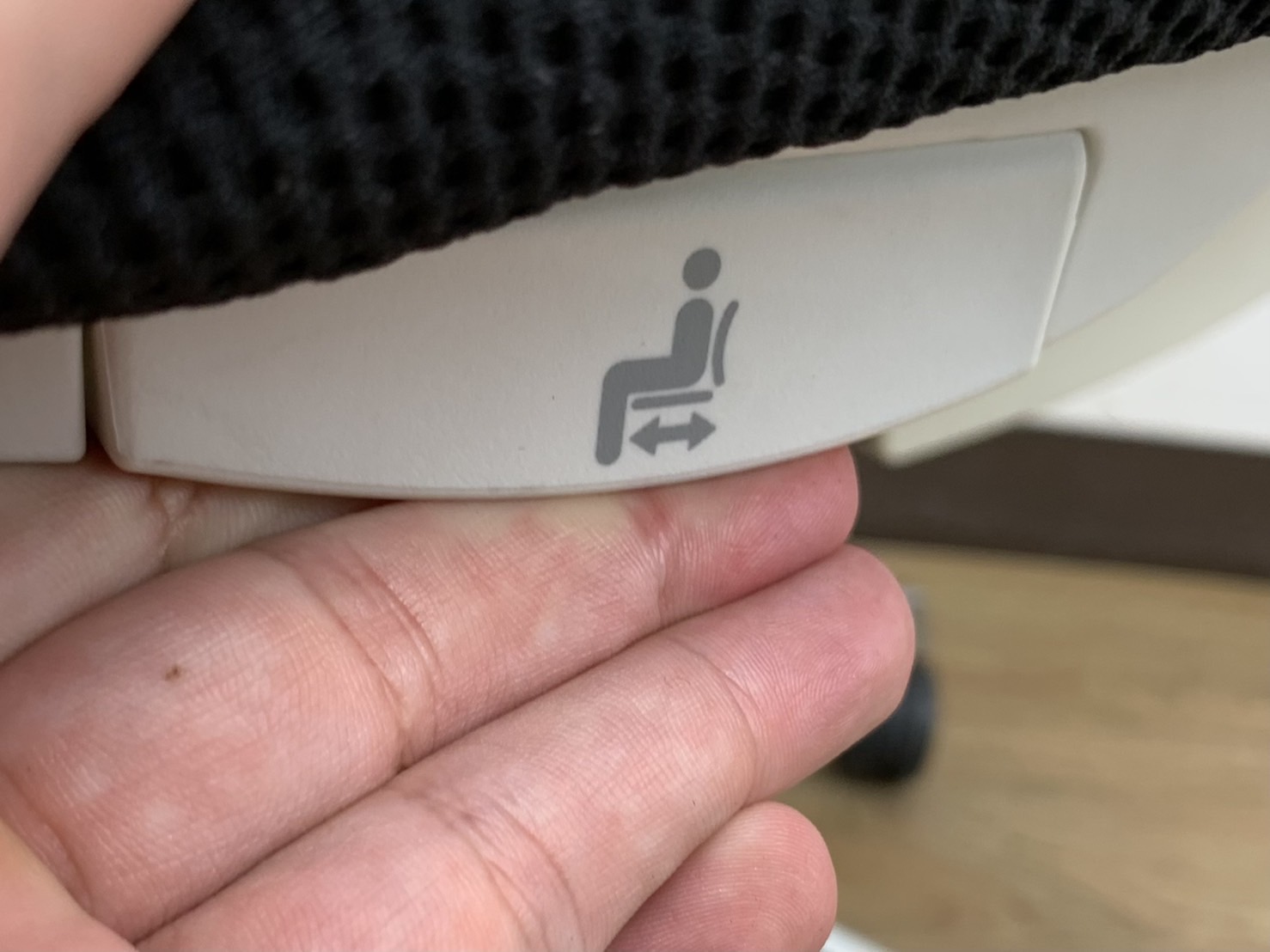 - 座面の左にあるレバー操作により、座面の奥行き調整が可能です。(ストローク:50mm)