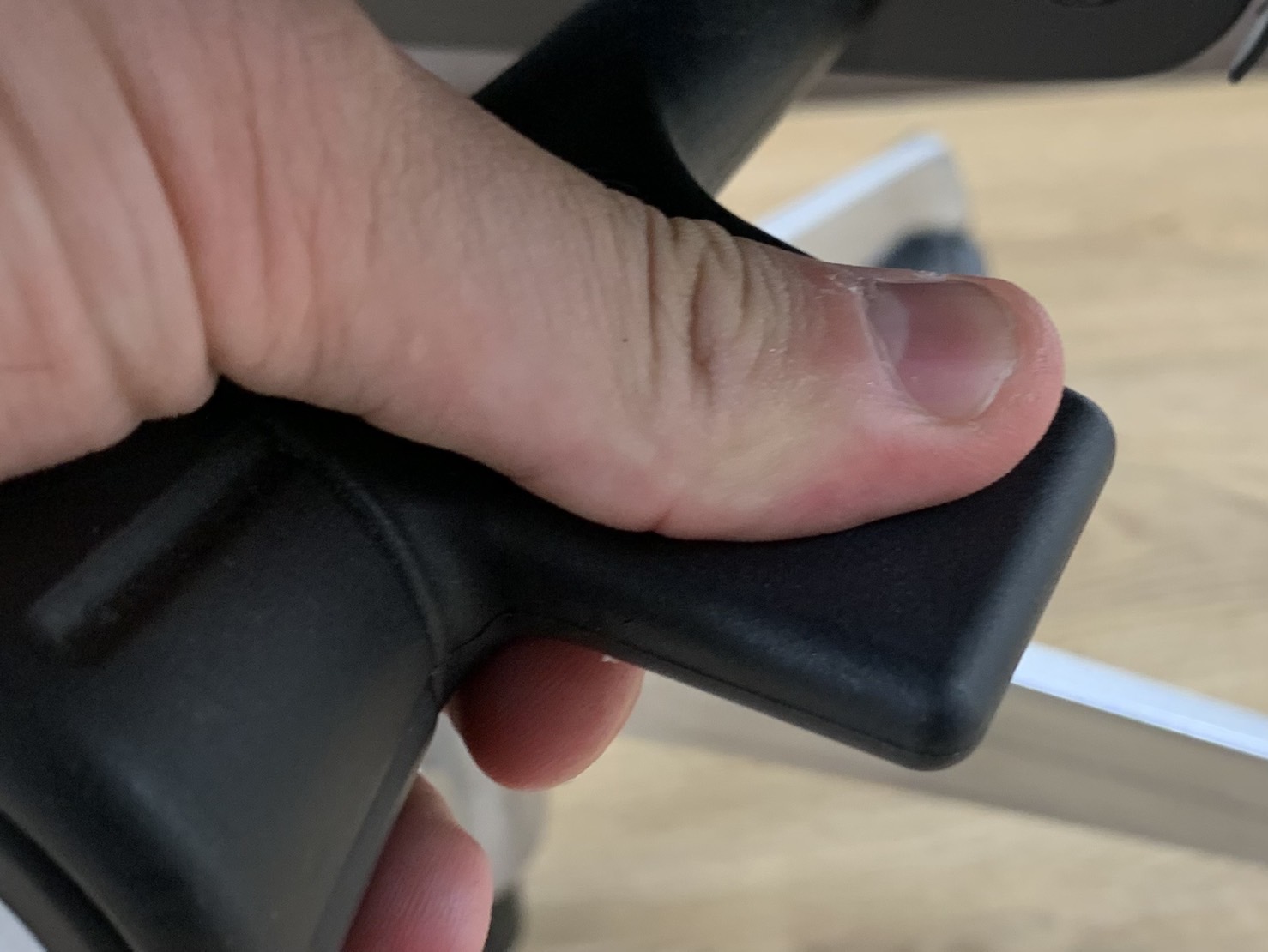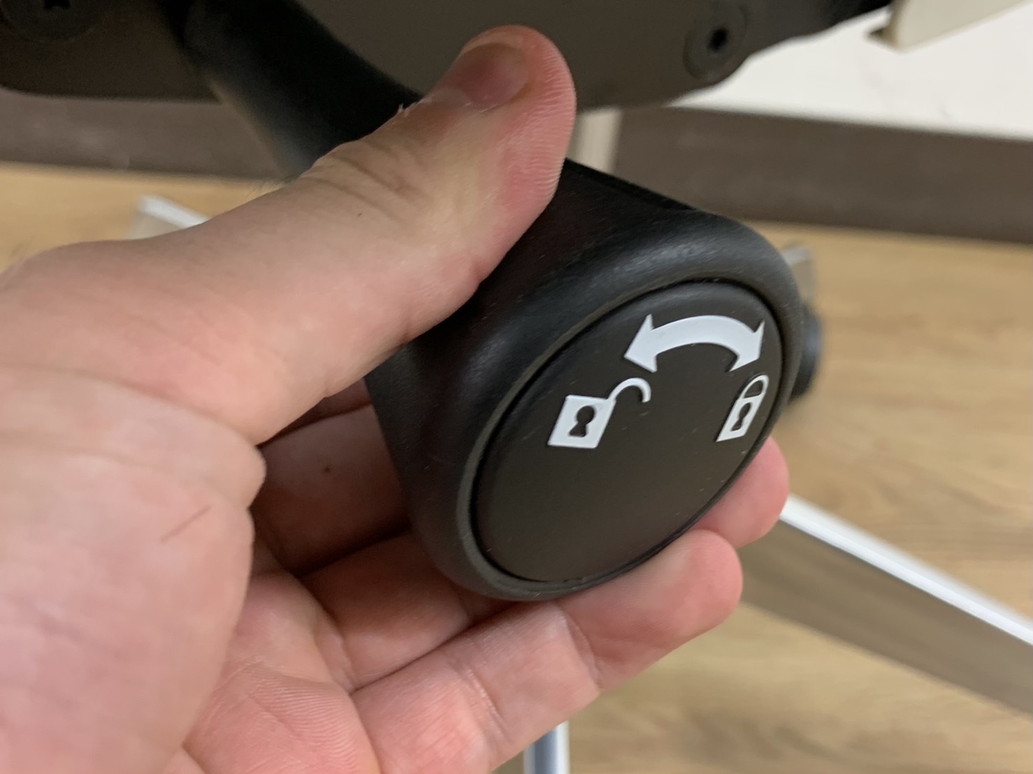 - 座面右下のダイヤル操作で、リクライニングの強弱調整が行えます。これまでのダイヤル式よりも、少ない回転数で、最弱?最強の調整が可能です。