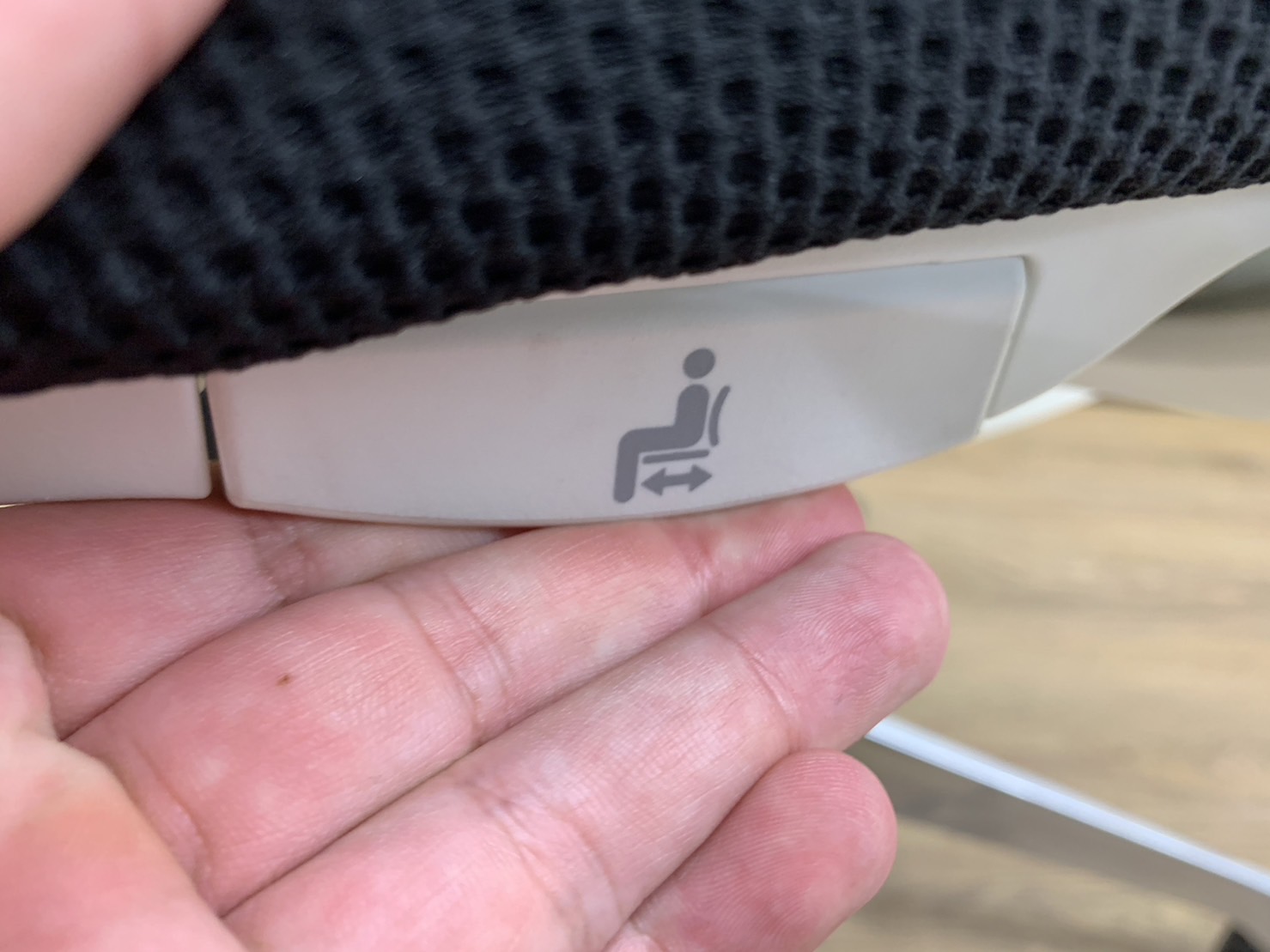 - 座面の左にあるレバー操作により、座面の奥行き調整が可能です。(ストローク:50mm)
