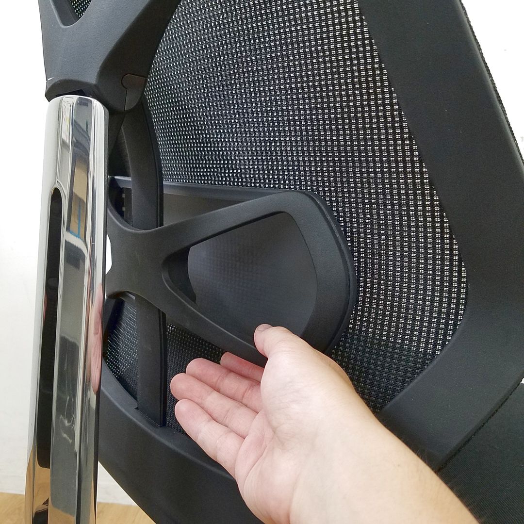 執務姿勢をとると、背フレームの腰部が内側にしなることでメッシュのテンションが弱まります。