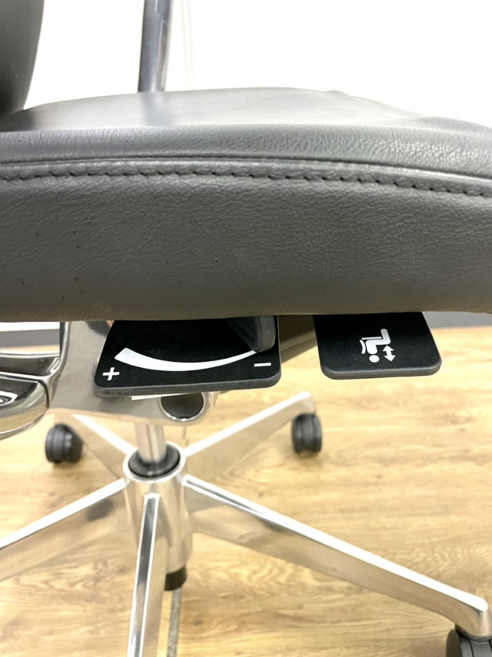 座面の高さや前後などの基本的な調整レバーが座面裏の前方に集約されており、姿勢を変えずに調節ができます。