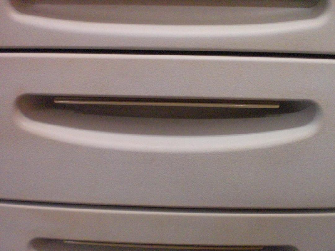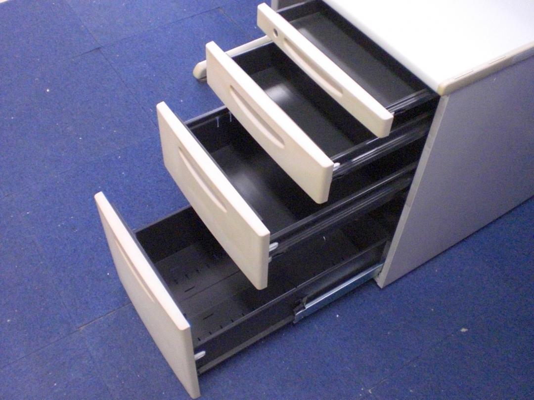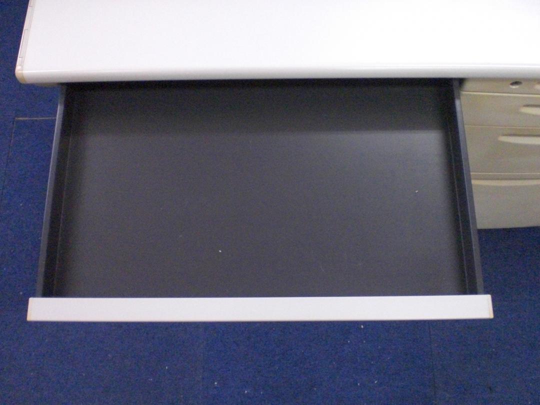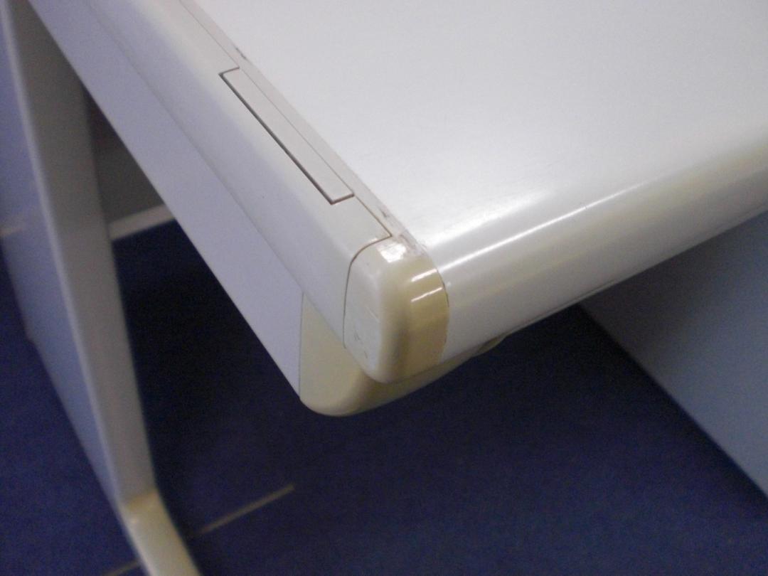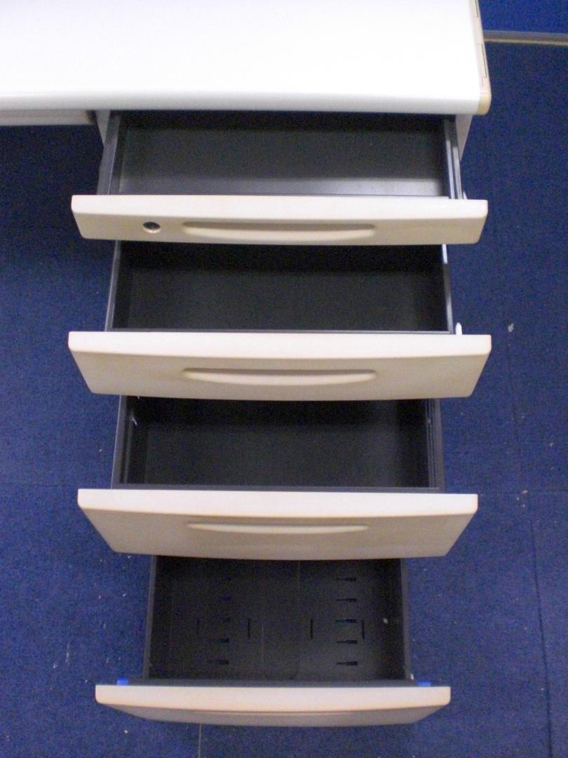 - 袖机のワゴンは、最下段がロング引出しになっており、従来より収納力120%アップ。