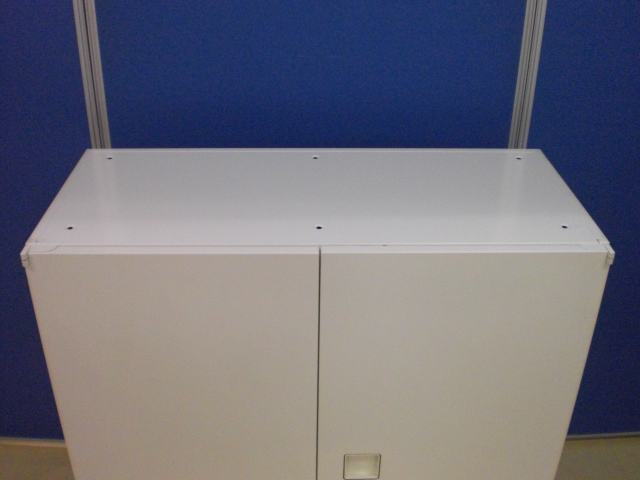 【オフィスの書類をスッキリ整理!取っ手がどの方向からでも開くマルチハンドル!】■オカムラ(okamura)製 レクトラインシリーズ 両開き書庫 ローキャビネット ■本体色:ホワイト ■シリンダー錠 ■ナチュラル天板付き