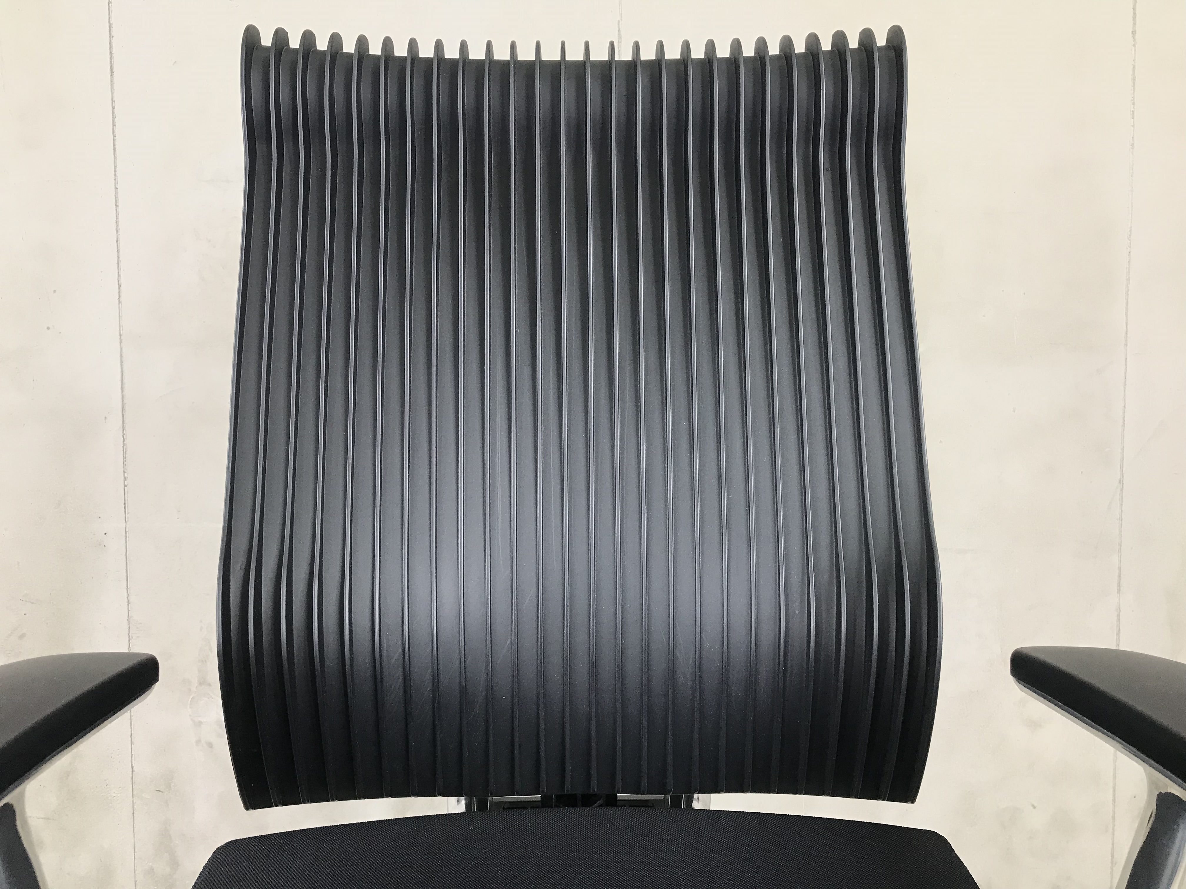 見た目は少し硬そうに見えるエラストマー素材ですが、座ってみると程よいしなり具合のやわらかな座り心地で、背中が痛くなるようなことはまるでありません。面ではなく線で支えることで、背面の通気性の良さは抜群です。