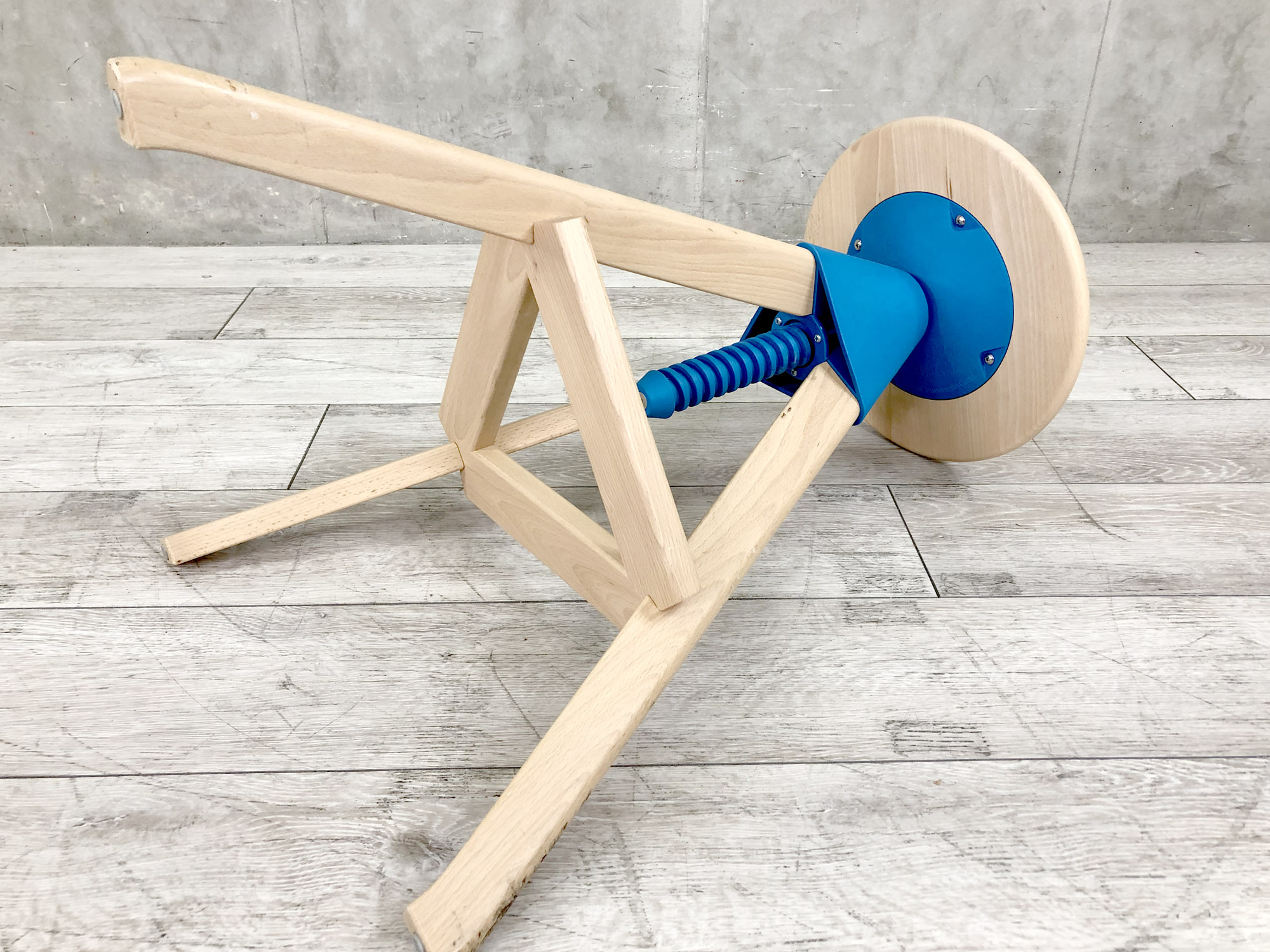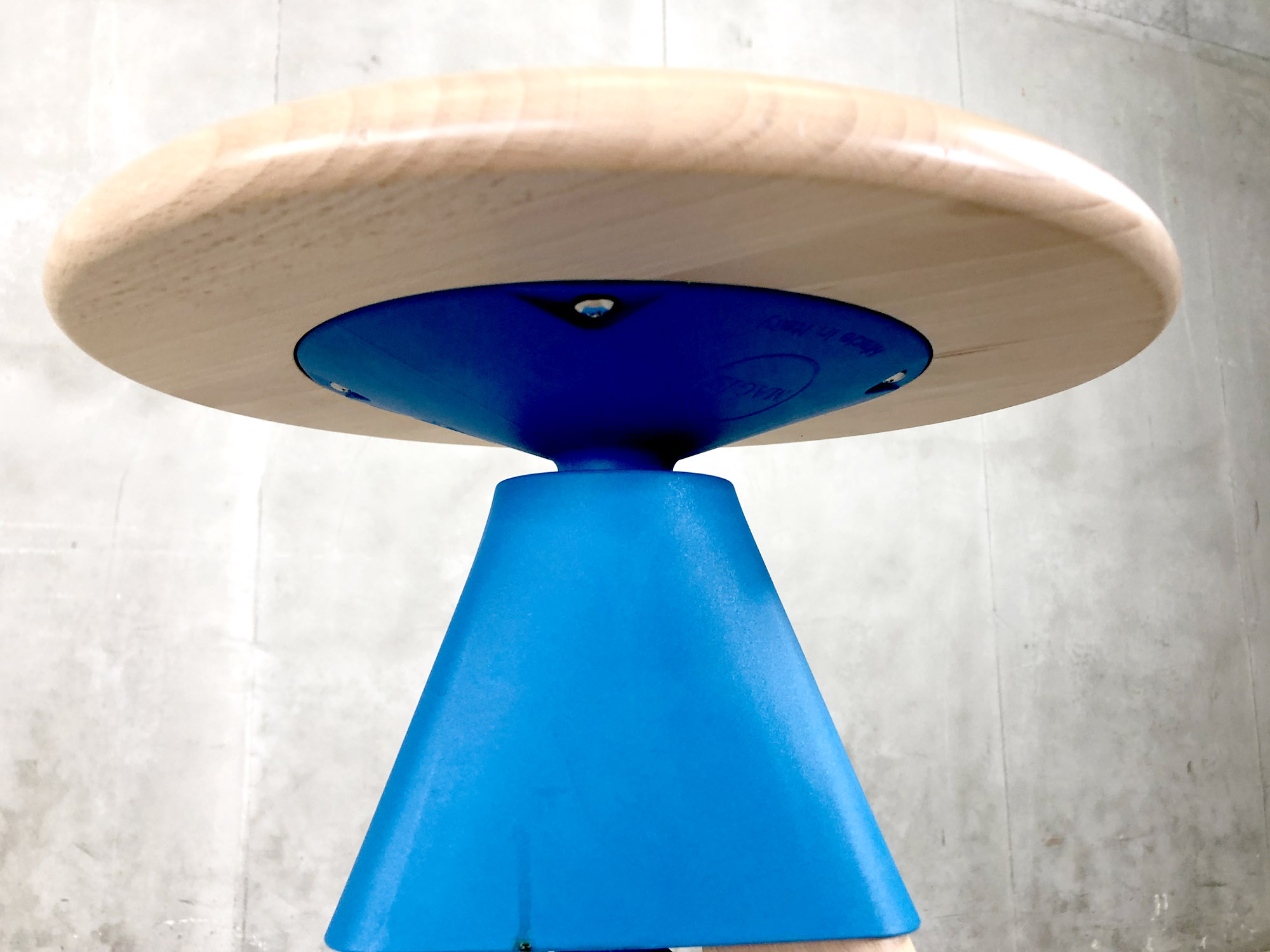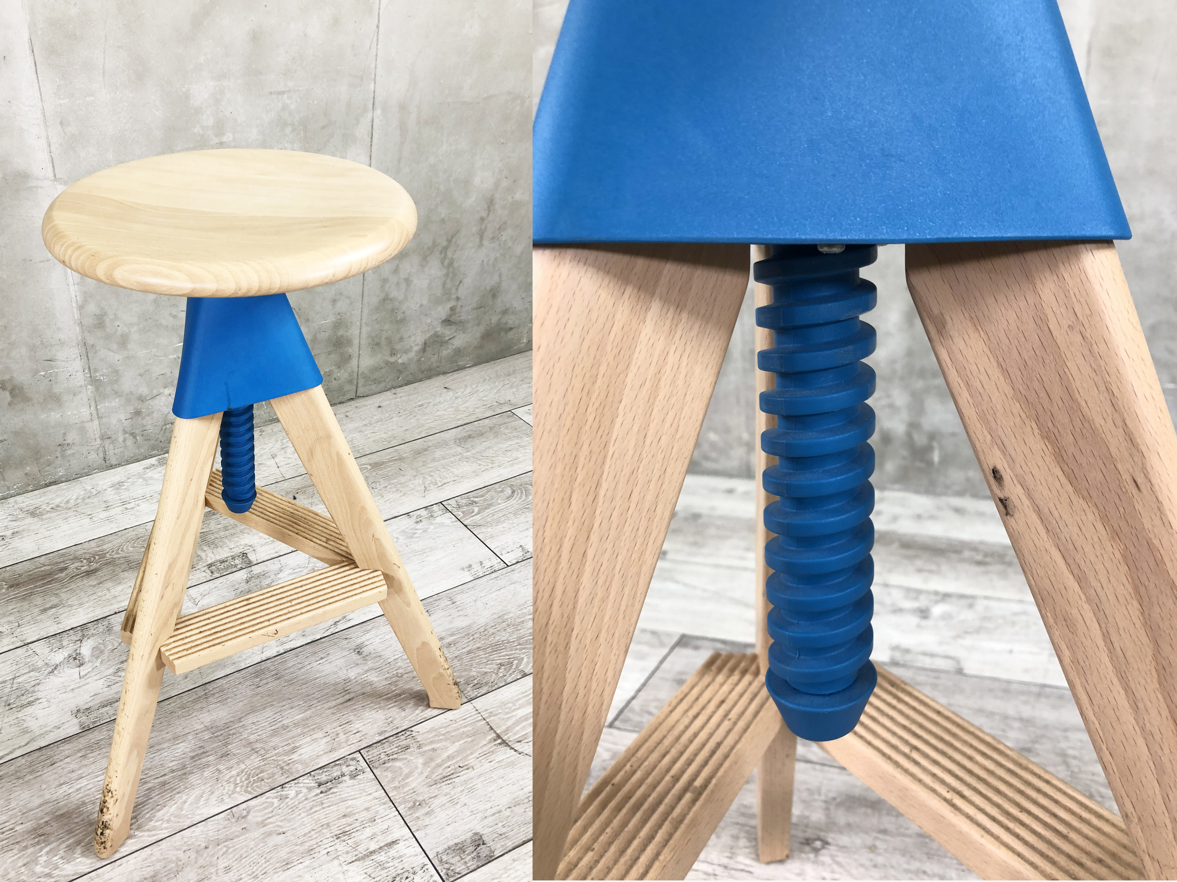 形は古典的な作業用スツールでしが、機構部に使われた色鮮やかな樹脂と、木の質感との対比が斬新な印象を与えてくれます。