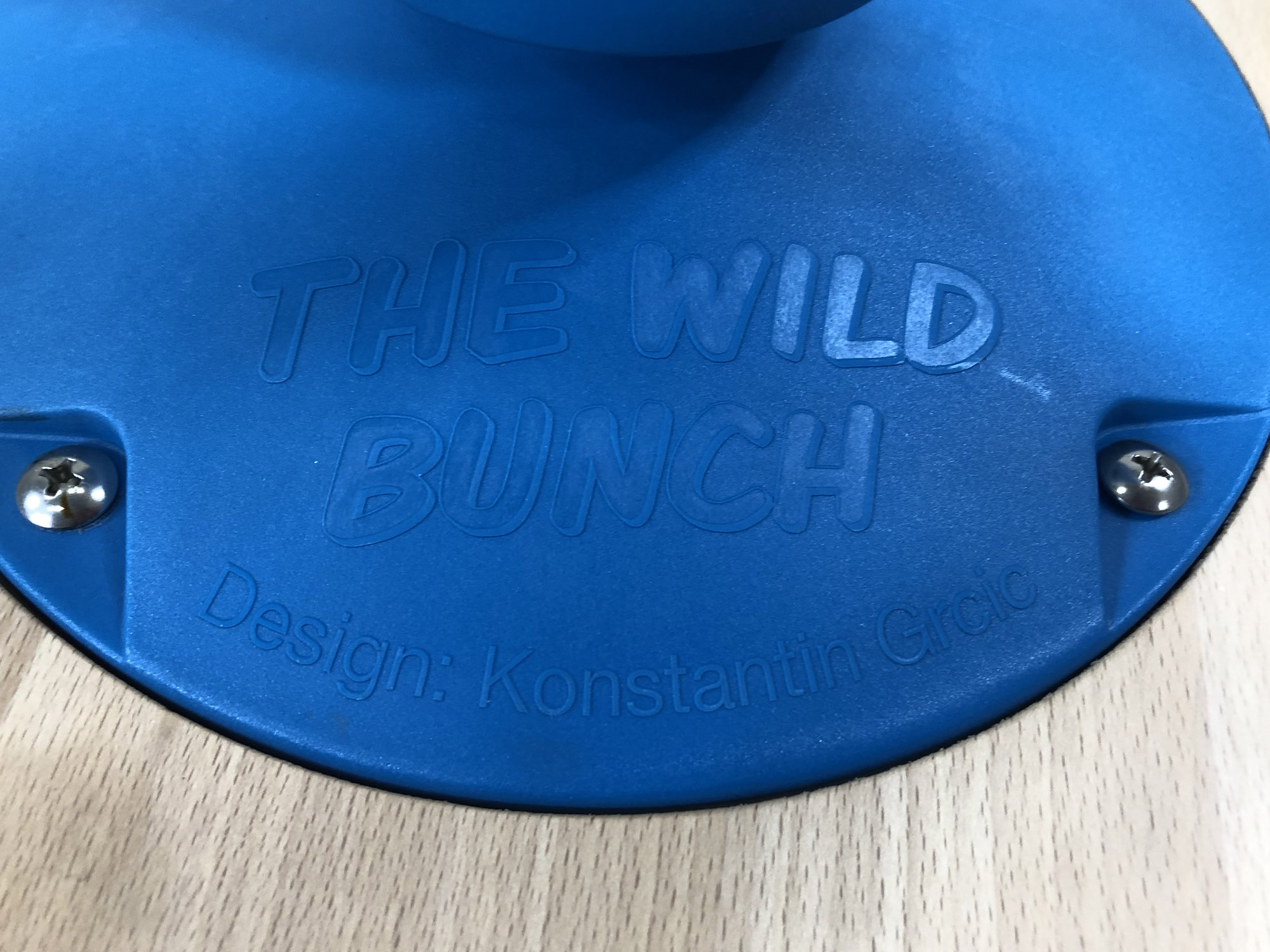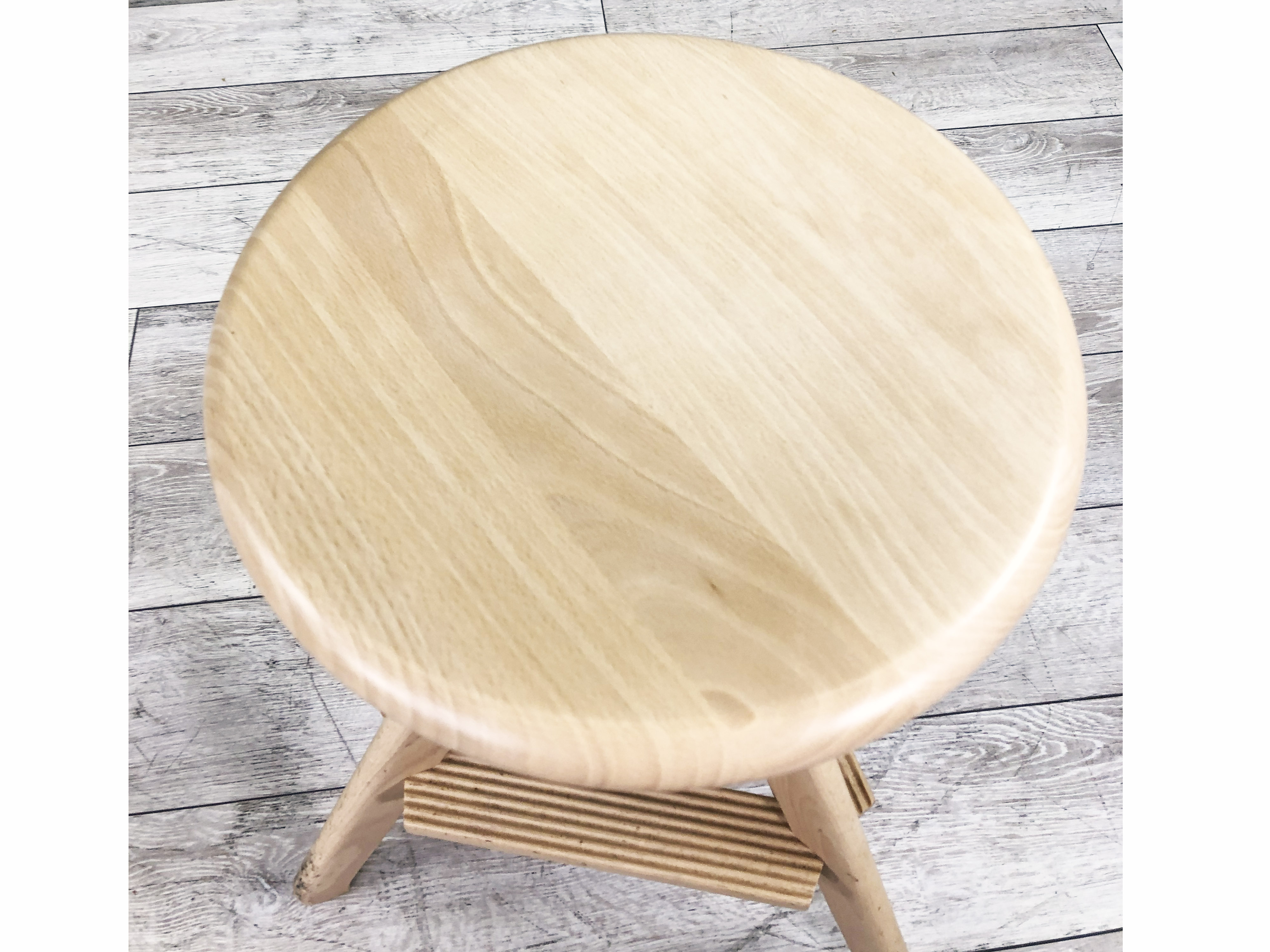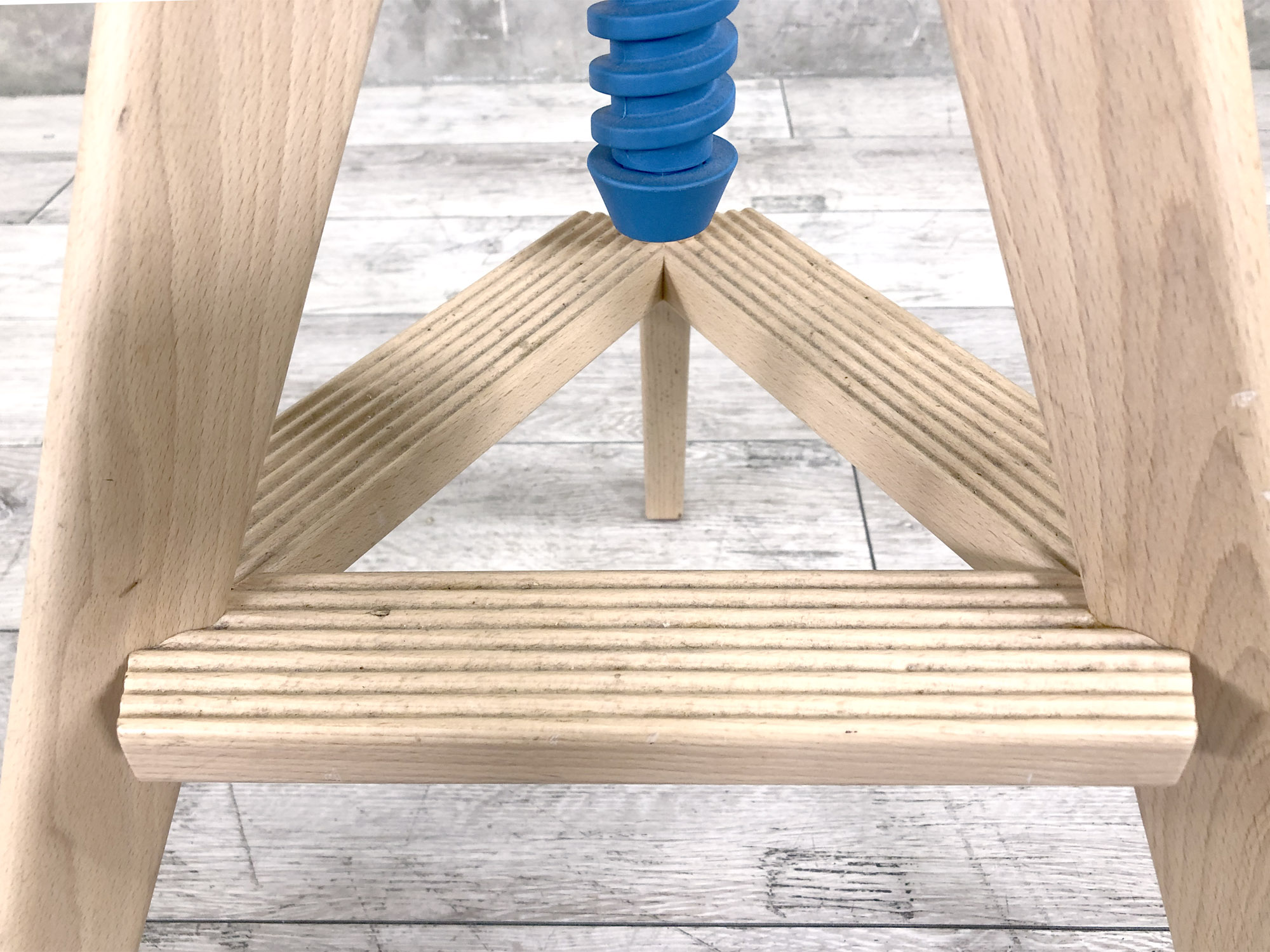 形は古典的な作業用スツールでしが、機構部に使われた色鮮やかな樹脂と、木の質感との対比が斬新な印象を与えてくれます。