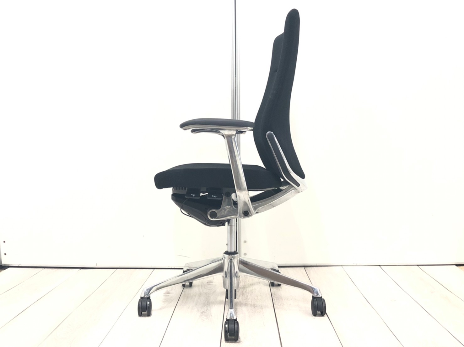 - リクライニングの固定と解除、リクライニング反力の強弱、座面の高さ調整、座面のスライド調整の操作を、すべて座面の裏側に集約。すべての調整を無駄な動きをすることなく、座ったままの状態で行えます。