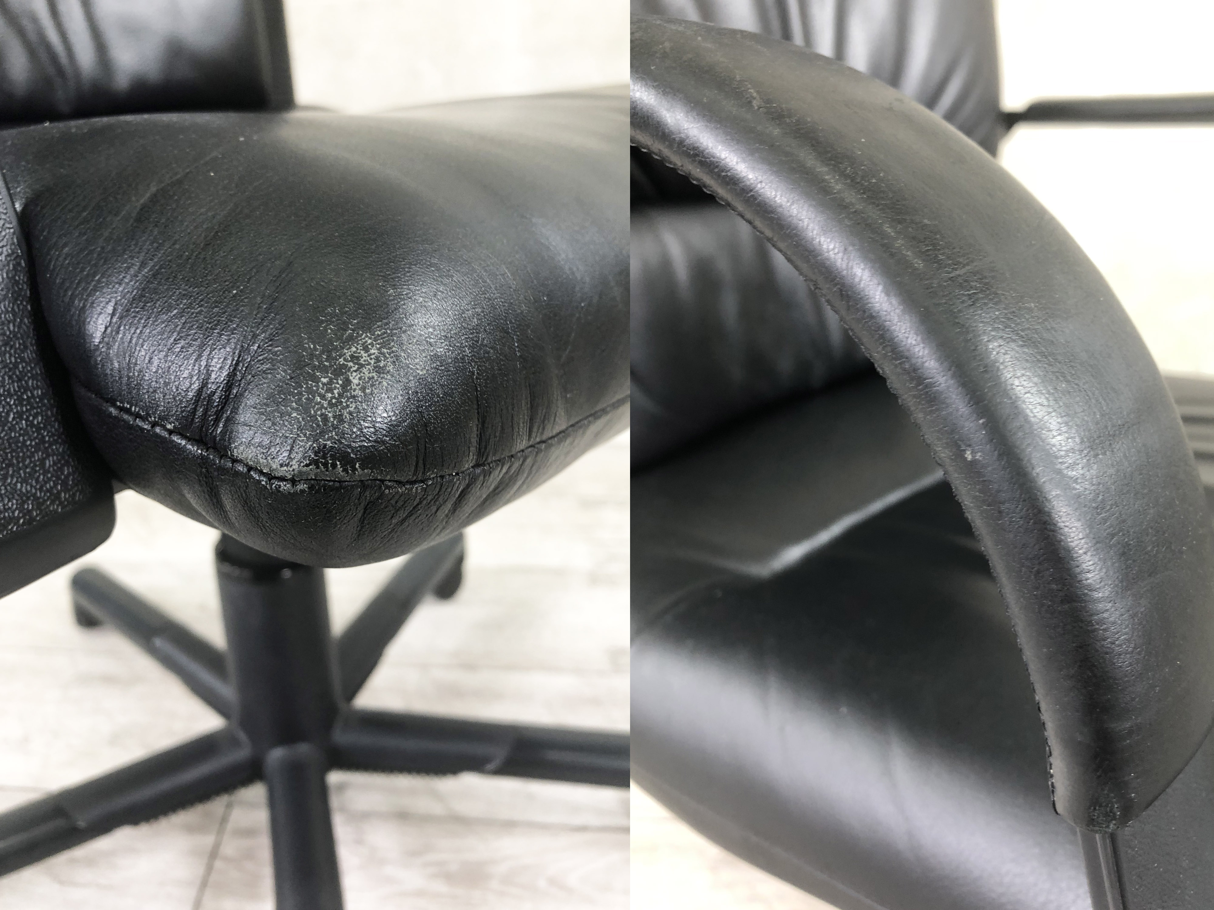 - 若干あり傷・破れ・ほつれ・へたり・しわが一部ある。(例、座面・背もたれ、脚部等にある。)