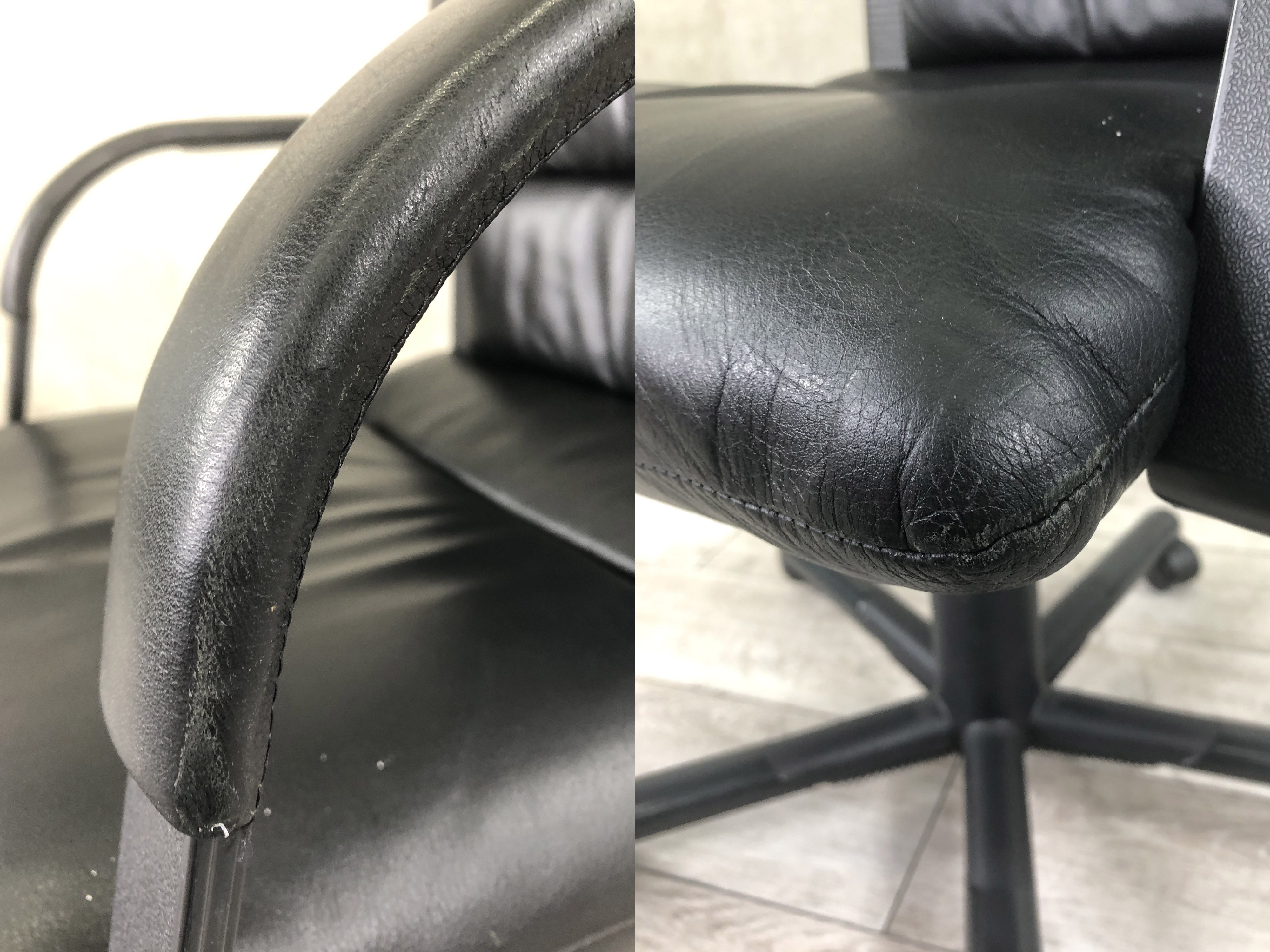 - あり黄ばみ・変色が広い範囲にうっすらある、または濃い黄ばみ・変色が一部ある。(例、座面・背もたれ、脚部等にある。)