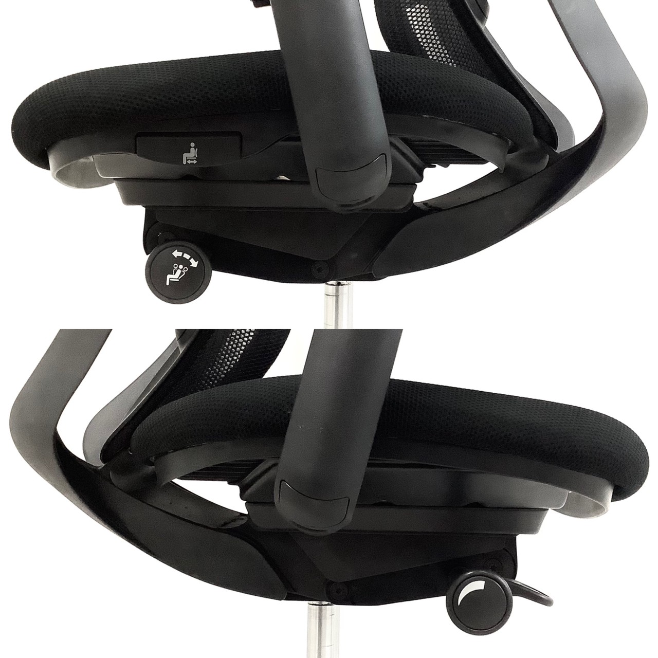 - 座面右下のダイヤル操作で、リクライニングの強弱調整が行えます。これまでのダイヤル式よりも、少ない回転数で、最弱?最強の調整が可能です。