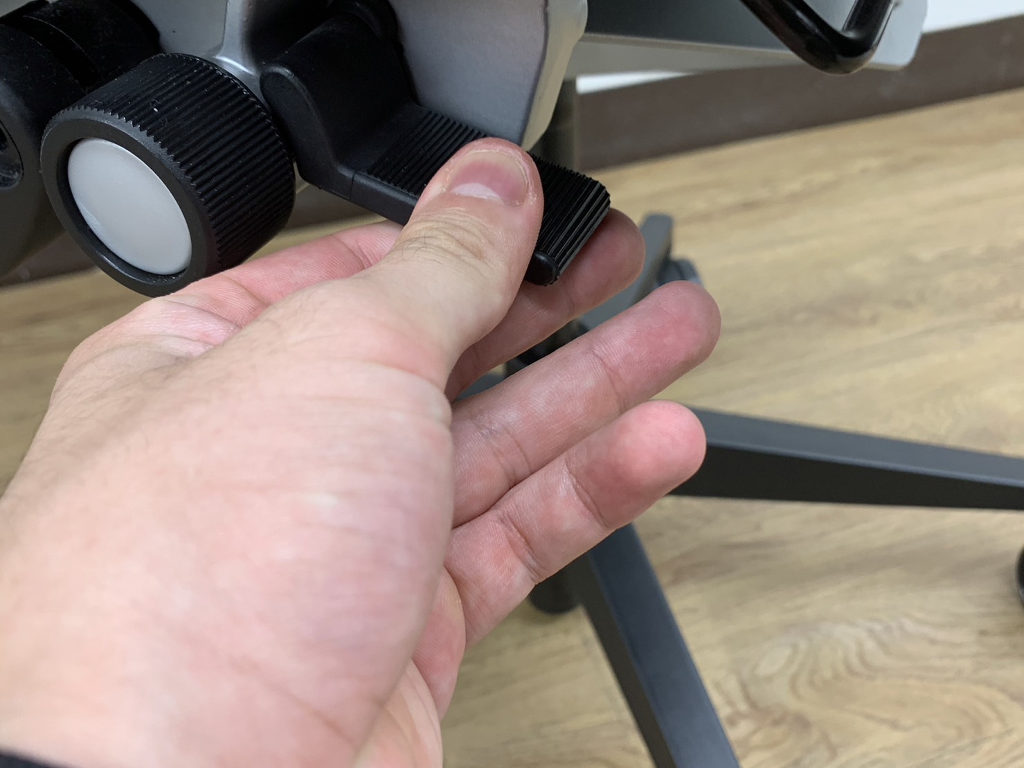 - レバーを引き上げながら座面を前後にスライドさせ、レバーを放すとロックします。背もたれに身体をつけた状態で膝の裏側と座面のエッジの間に5-8センチほどの隙間ができるのが理想的です。
