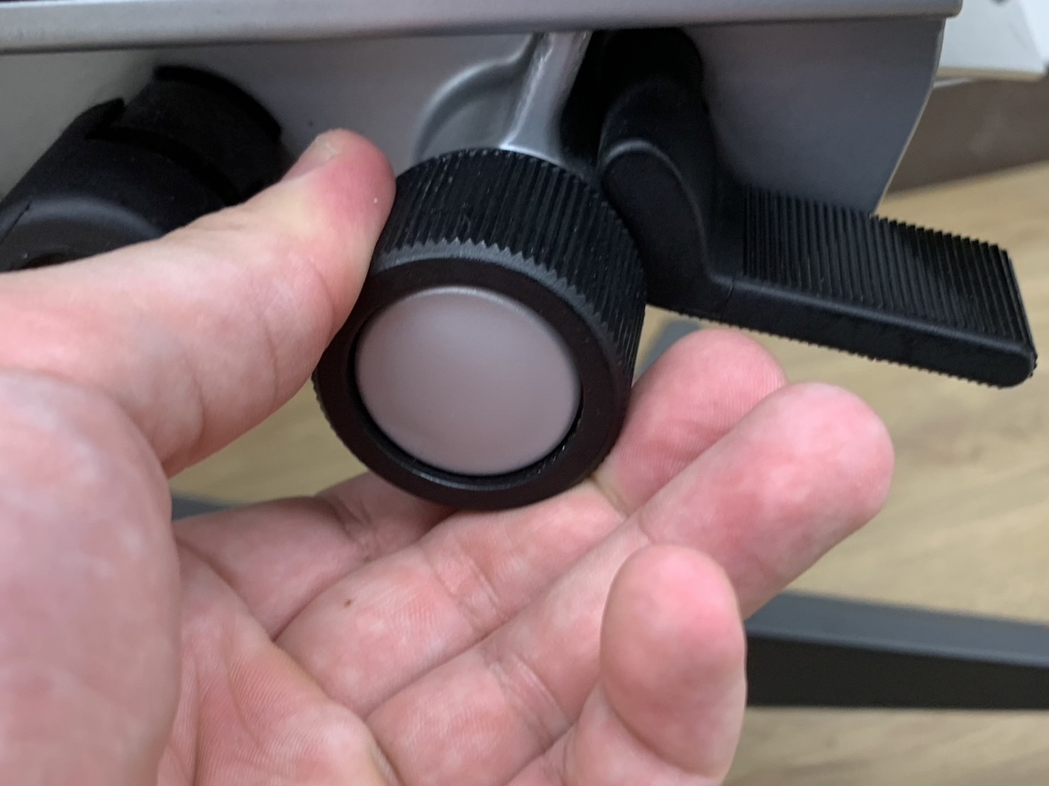 - アームの高さはキャップ下にあるボタンを持ち上げながら上下に調節、アームの位置はアームキャップをつかみ、上下、左右、角度にスライドさせて調節できます。身体の肘はなるべく身体に近づけ、手首とまっすぐになるように調節してください。