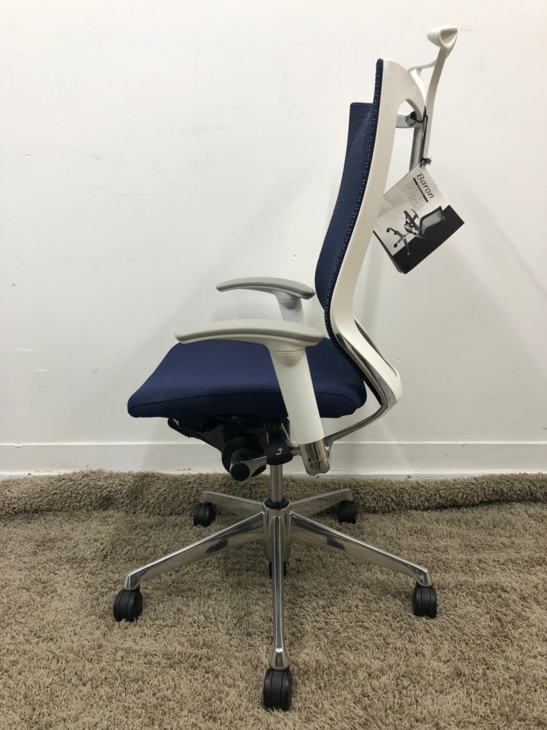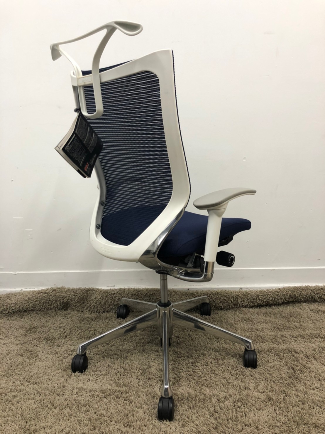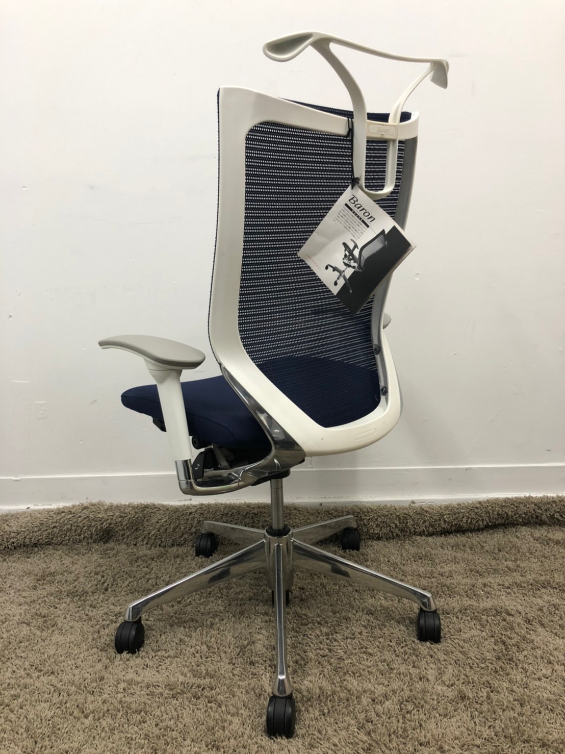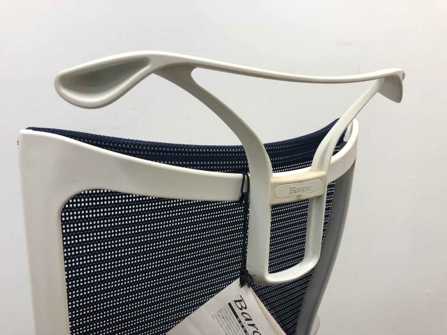 【4脚入荷】【オフィスの執務室、会議室におすすめ!】■オカムラ(okamura)製 バロン(Baron)チェア 肘付き ハイバック 背面メッシュ ■可動肘 ■ダークブルー × ホワイトシェル【硬めの座面が大人気!国産メッシュチェアの代表格!】