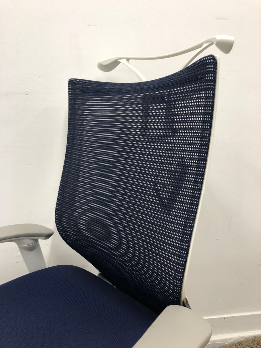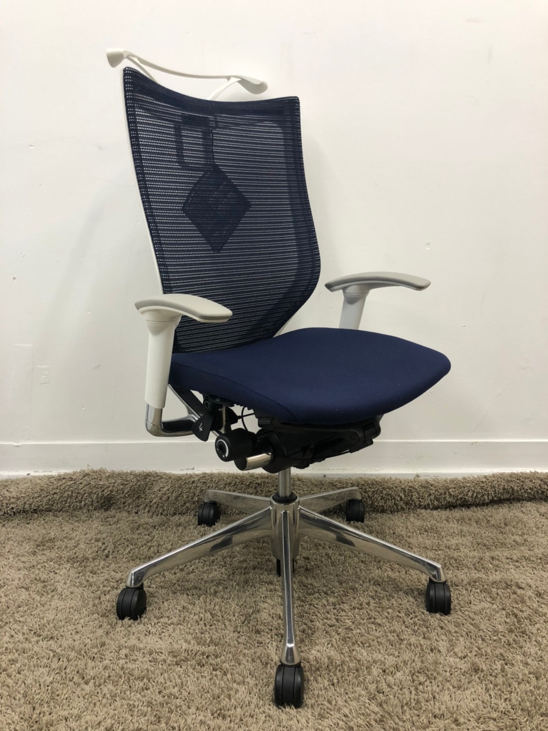 【2脚入荷】【オフィスの執務室、会議室におすすめ!】■オカムラ(okamura)製 バロン(Baron)チェア 肘付き ハイバック 背面メッシュ ■可動肘 ■ダークブルー × ホワイトシェル【硬めの座面が大人気!国産メッシュチェアの代表格!】