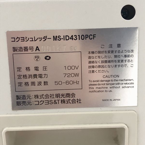 明光商会(コクヨより販売) MS-ID4310PCF 中古オフィスシュレッダー パワークロスカット採用- 名古屋千種店