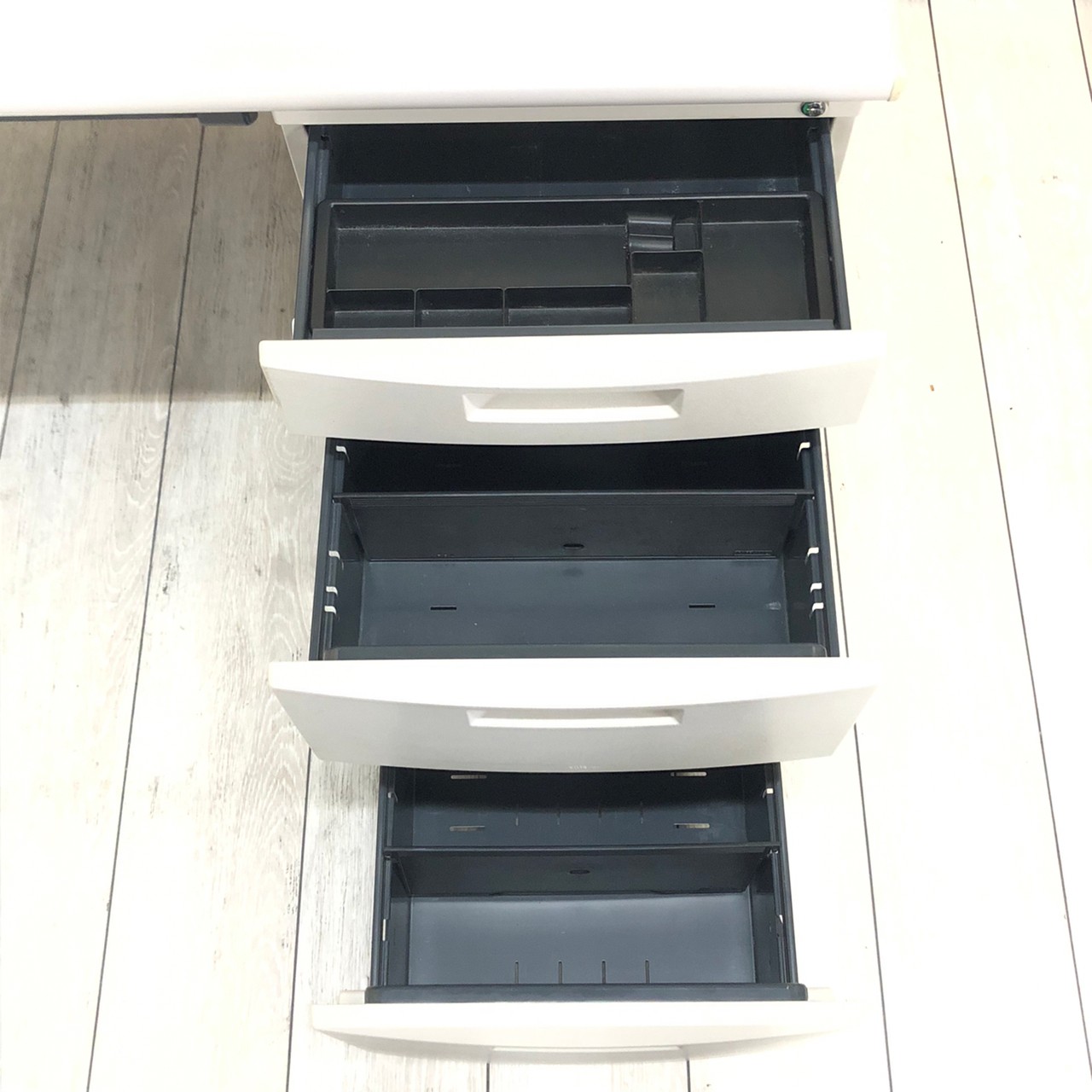 - 基本的なPCデスクの機能を有するコスパの良いシリーズ。収納力や引出しのロック機能などの安全機能も備えています。