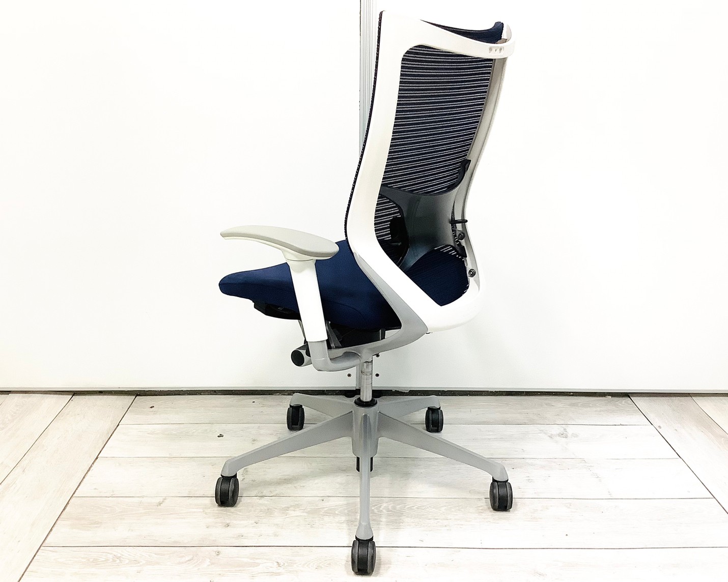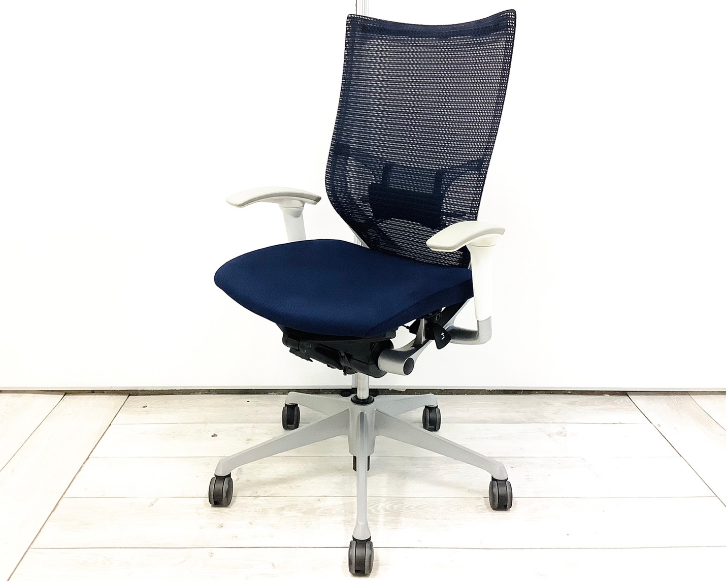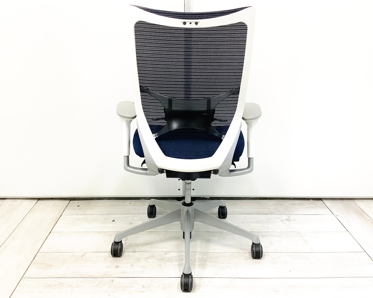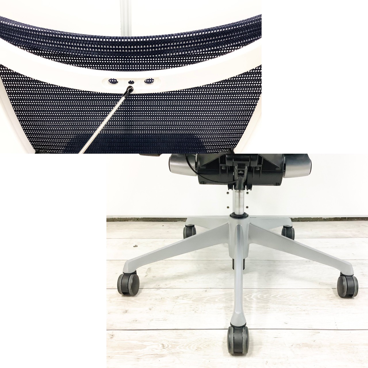 【オフィスの執務室、会議室におすすめ!】■オカムラ(okamura)製 バロン(Baron)チェア 肘付き ハイバック 背面メッシュ ■可動肘 ■ダークブルー × ホワイトシェル【硬めの座面が大人気!国産メッシュチェアの代表格!】【状態良好品!】