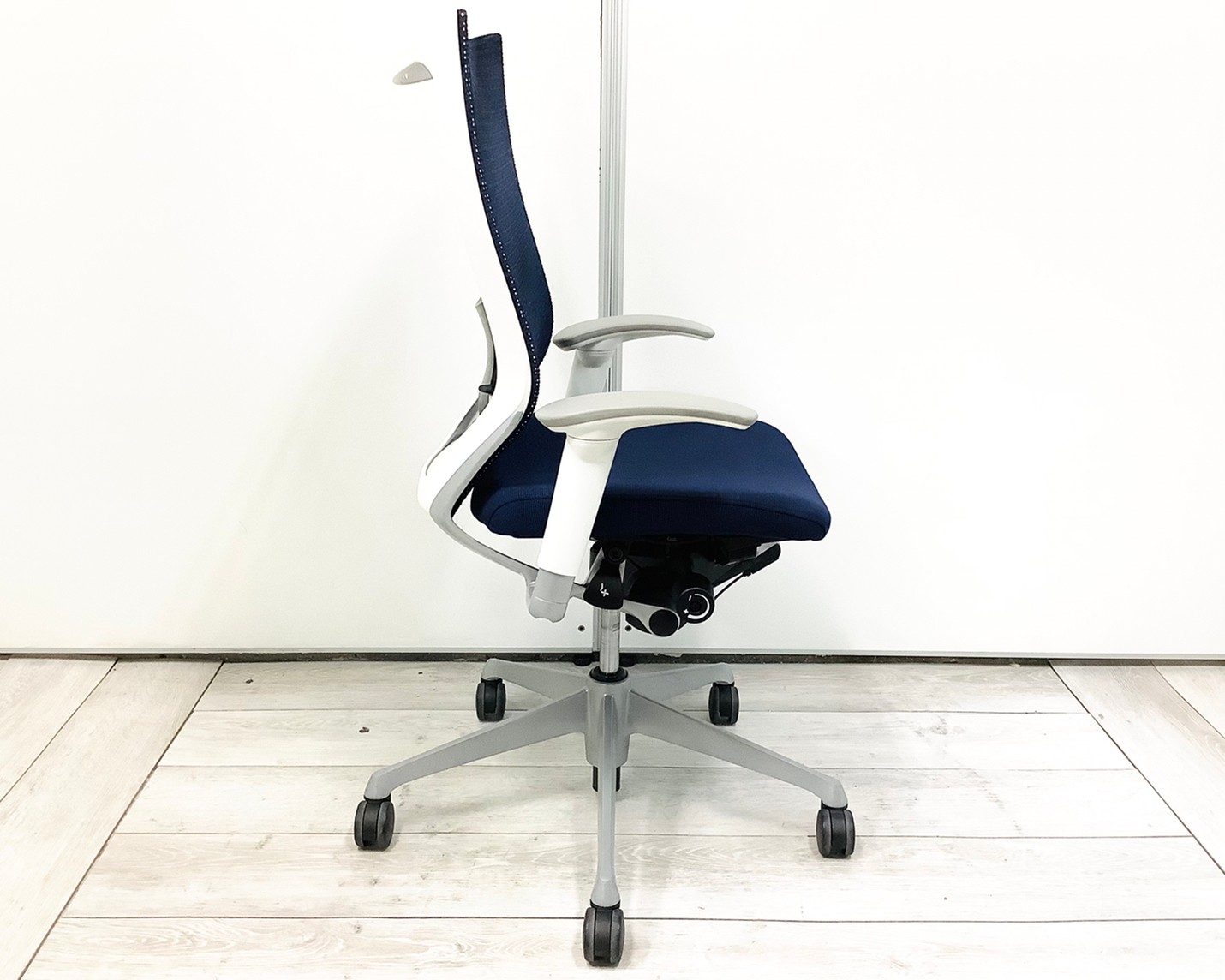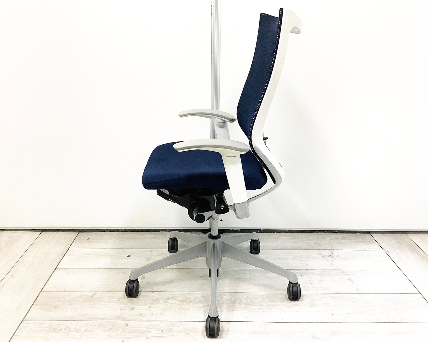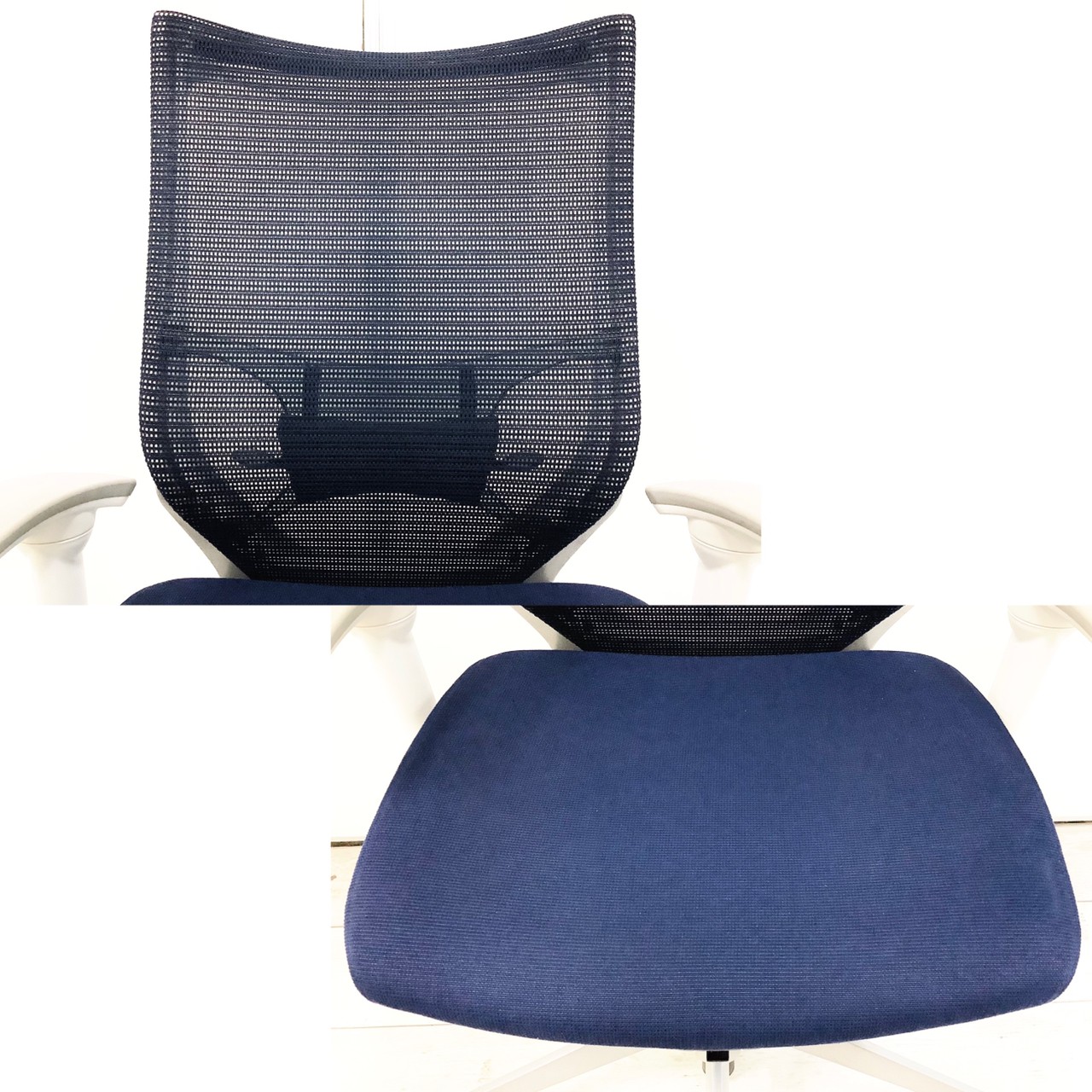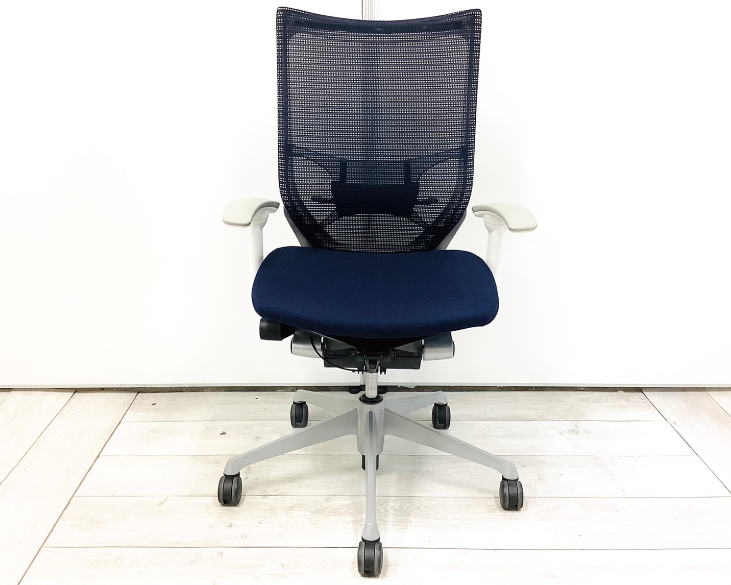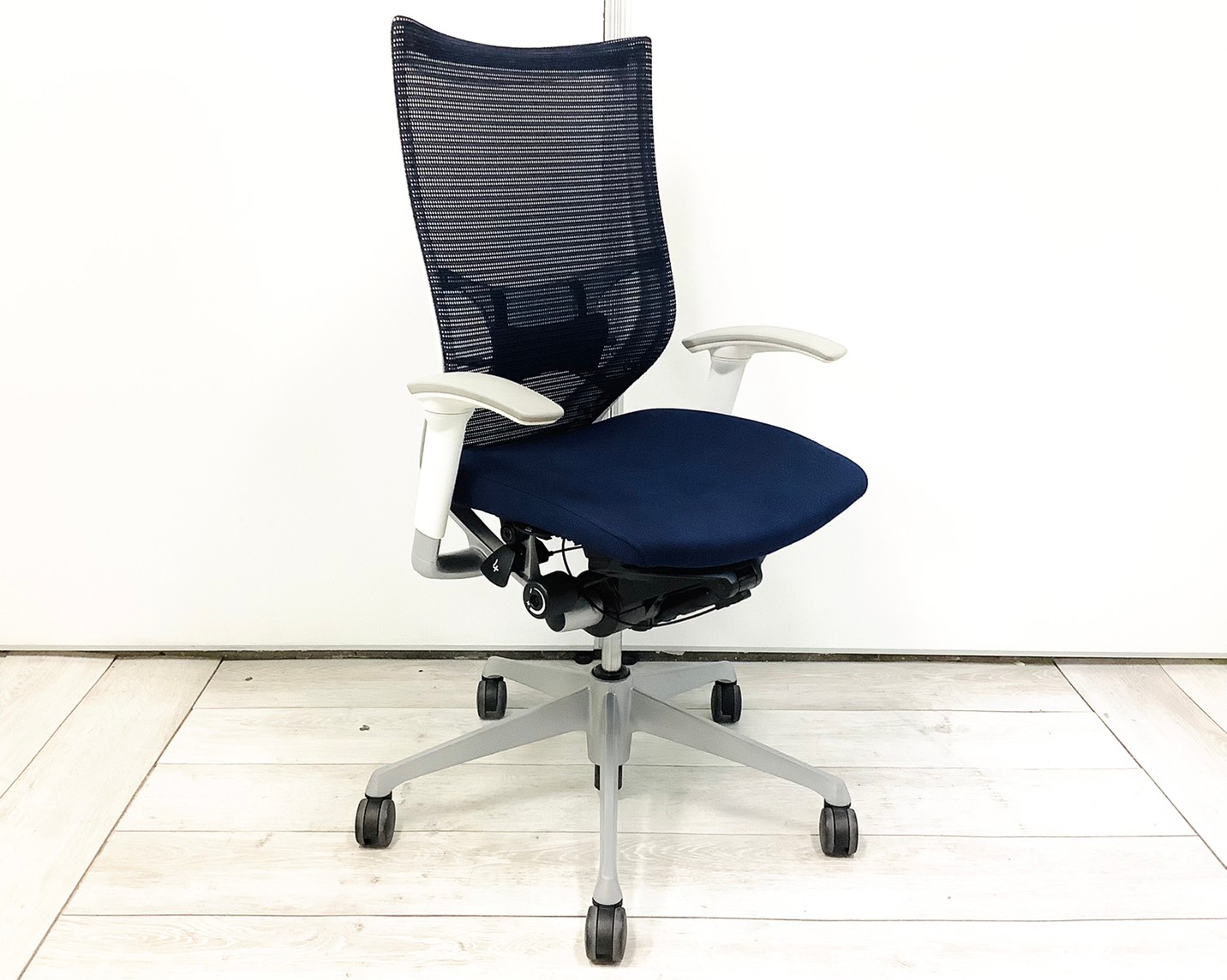 【オフィスの執務室、会議室におすすめ!】■オカムラ(okamura)製 バロン(Baron)チェア 肘付き ハイバック 背面メッシュ ■可動肘 ■ダークブルー × ホワイトシェル【硬めの座面が大人気!国産メッシュチェアの代表格!】【状態良好品!】