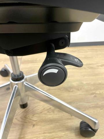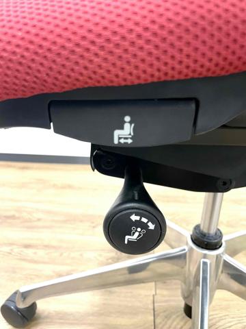 - 座面右下のダイヤル操作で、リクライニングの強弱調整が行えます。これまでのダイヤル式よりも、少ない回転数で、最弱?最強の調整が可能です。