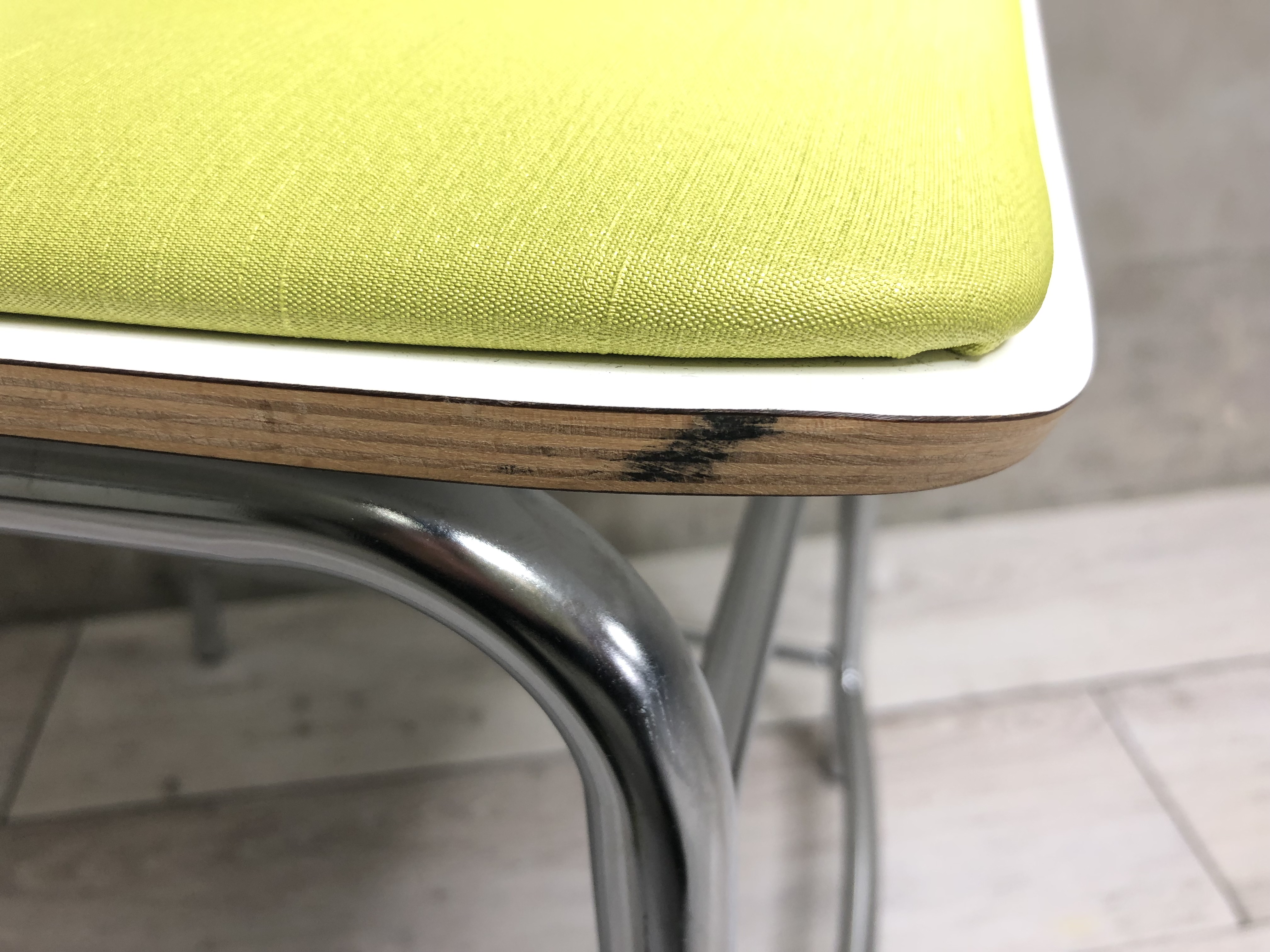 - かなり強い濃い黄ばみ・変色が商品全体にある。(例、座面・背もたれ、脚部等にある。)