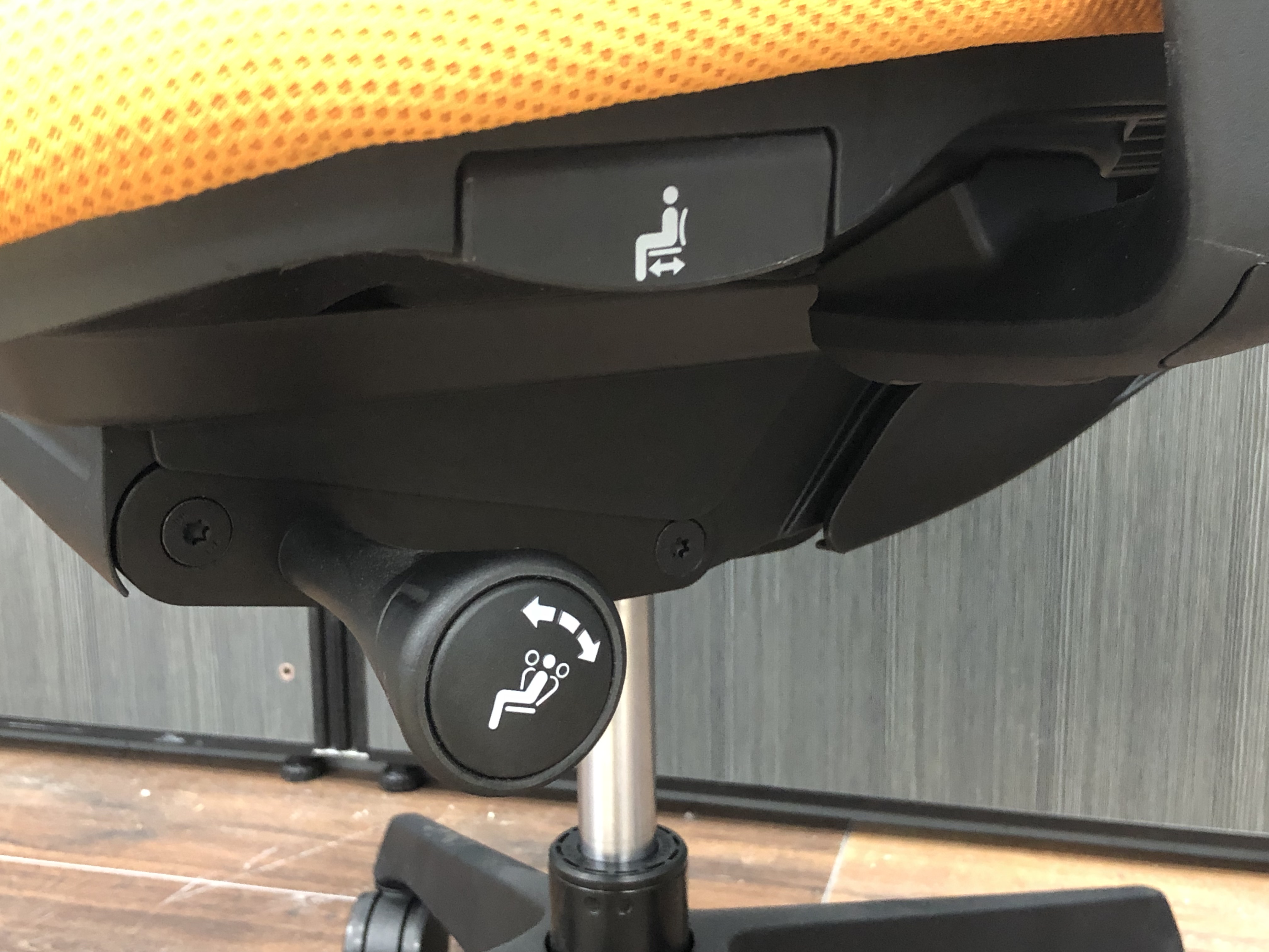 - 座面右下のダイヤル操作で、リクライニングの強弱調整が行えます。これまでのダイヤル式よりも、少ない回転数で、最弱?最強の調整が可能です。