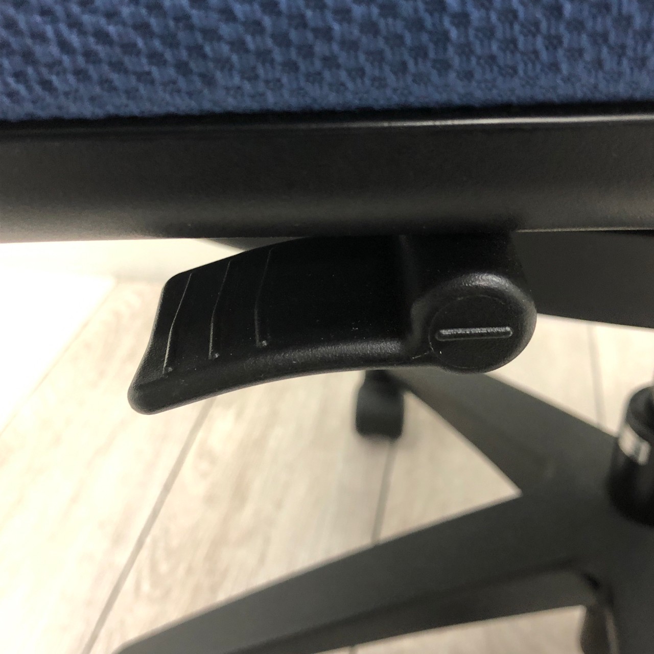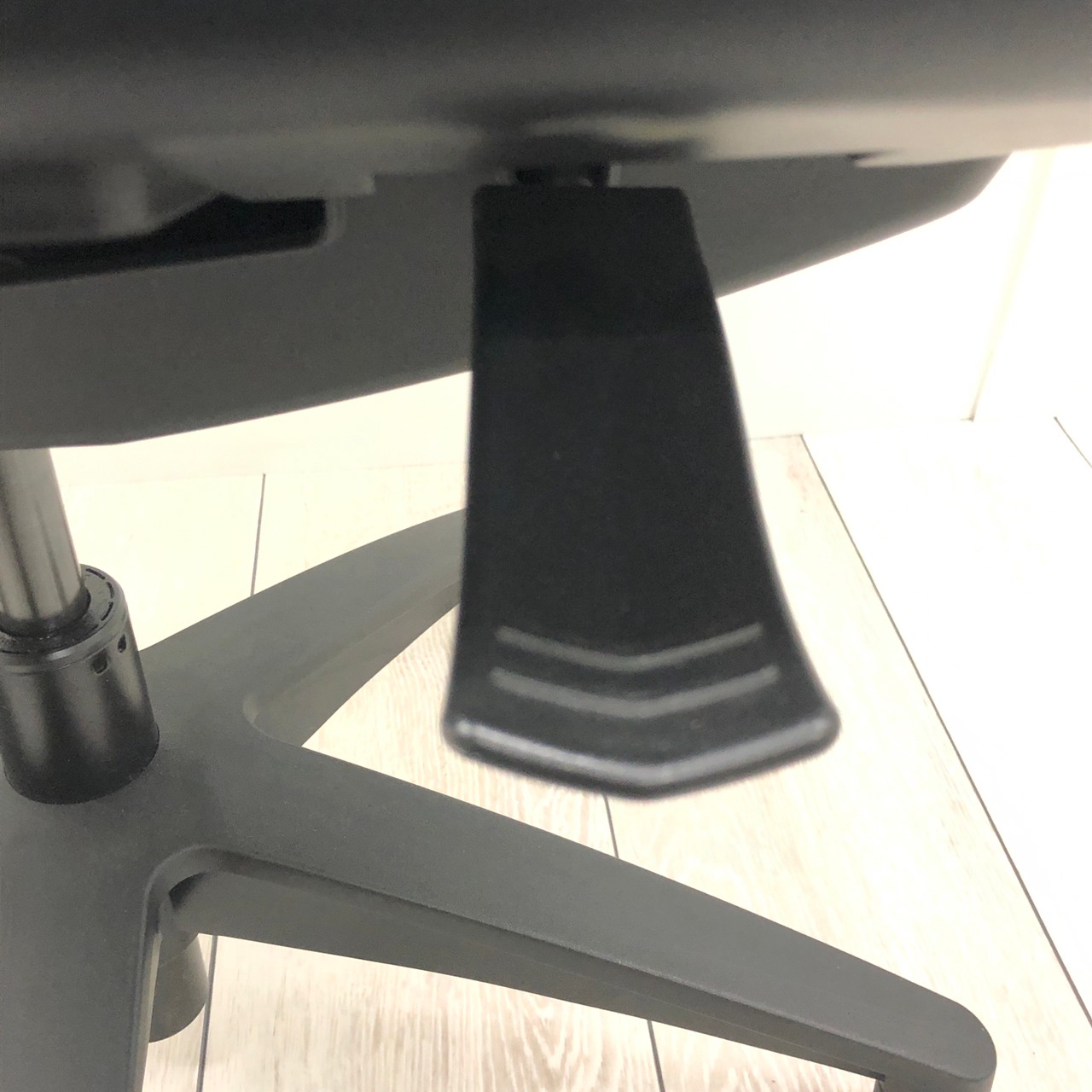 最前傾時に、背座の動きを止めるフロントワンロック機構のレバーが座面の下にあります。