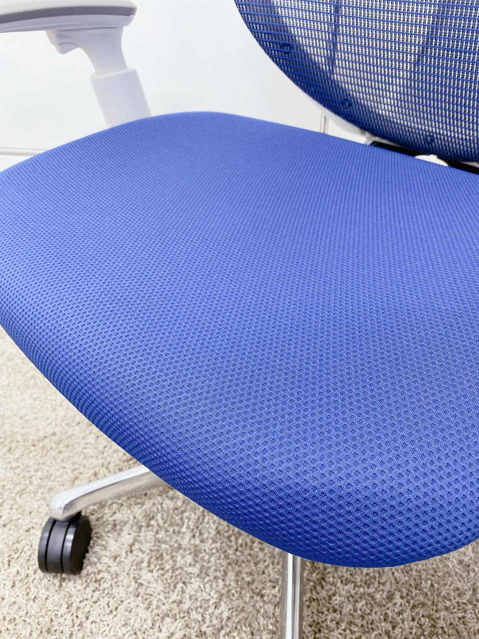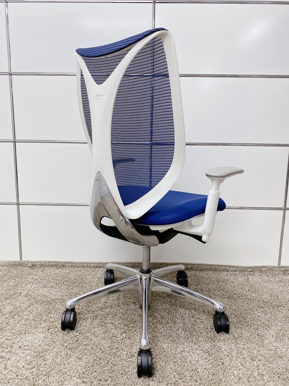 【前傾チルト付!流れるような美しいフォルムの最高級メッシュチェア!】■オカムラ(okamura)製 Sabrina(サブリナ) ハイバック 肘付き ■可動肘 ■背面メッシュ:アクアブルー 座面:ブルー ホワイトフレーム