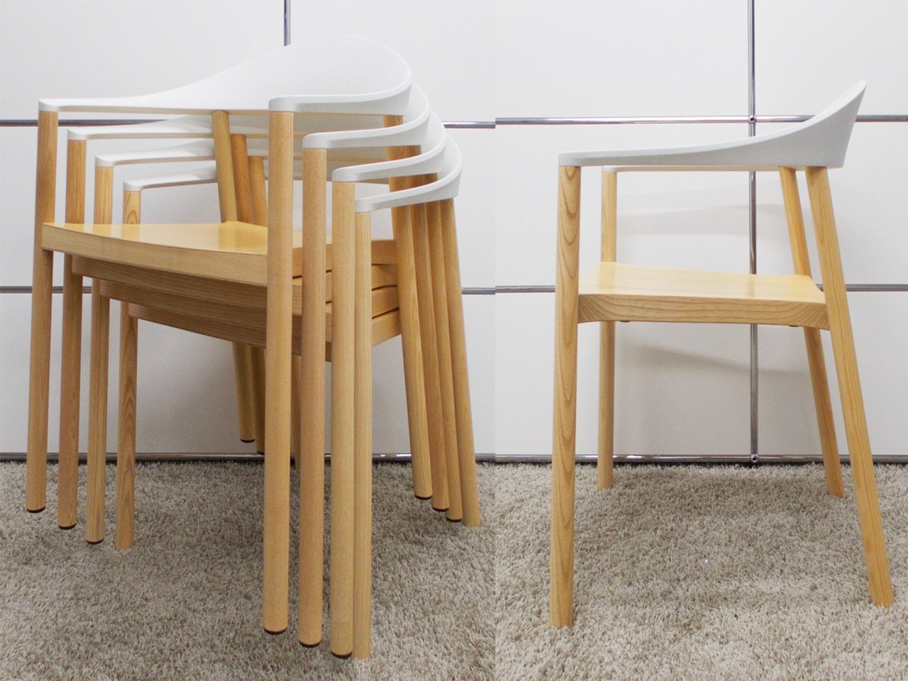 ゆるやかなカーブを描く一体型の背とアームが印象的なミニマルなデザインです。 ウッドとプラスチックという異素材を組み合わせたアームチェアはスタッキングしても美しい佇まいです。