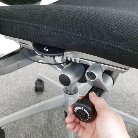 - ロッキングの強弱を調整するダイヤルがございます。体型に合わせてリクライニングの固さを座ったままで調整できます。