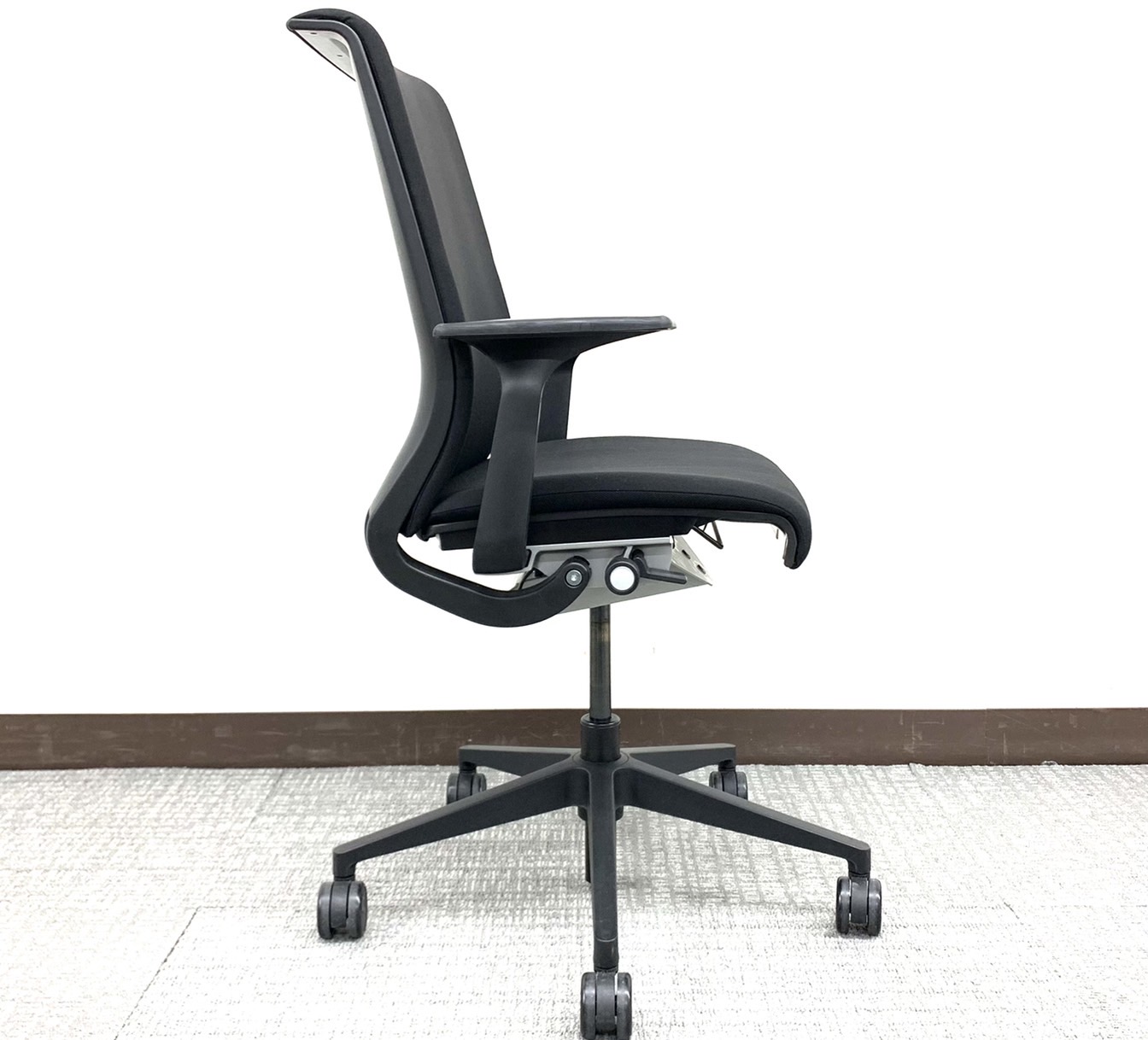 快適な座り心地に不可欠な調節機能である、上下昇降、座面の奥行き調整、リクライニングなどを備えており、操作もわかりやすく好評です。 特に、座面の奥行きは、座面下の左右に通った細いバーで調整でき、座ったままで軽やかに滑るように調整が可能です。 価格面では、新品では高めですが、中古は流通も多く、定価の3割前後の価格で高級チェアの座り心地を手に入れることができます!