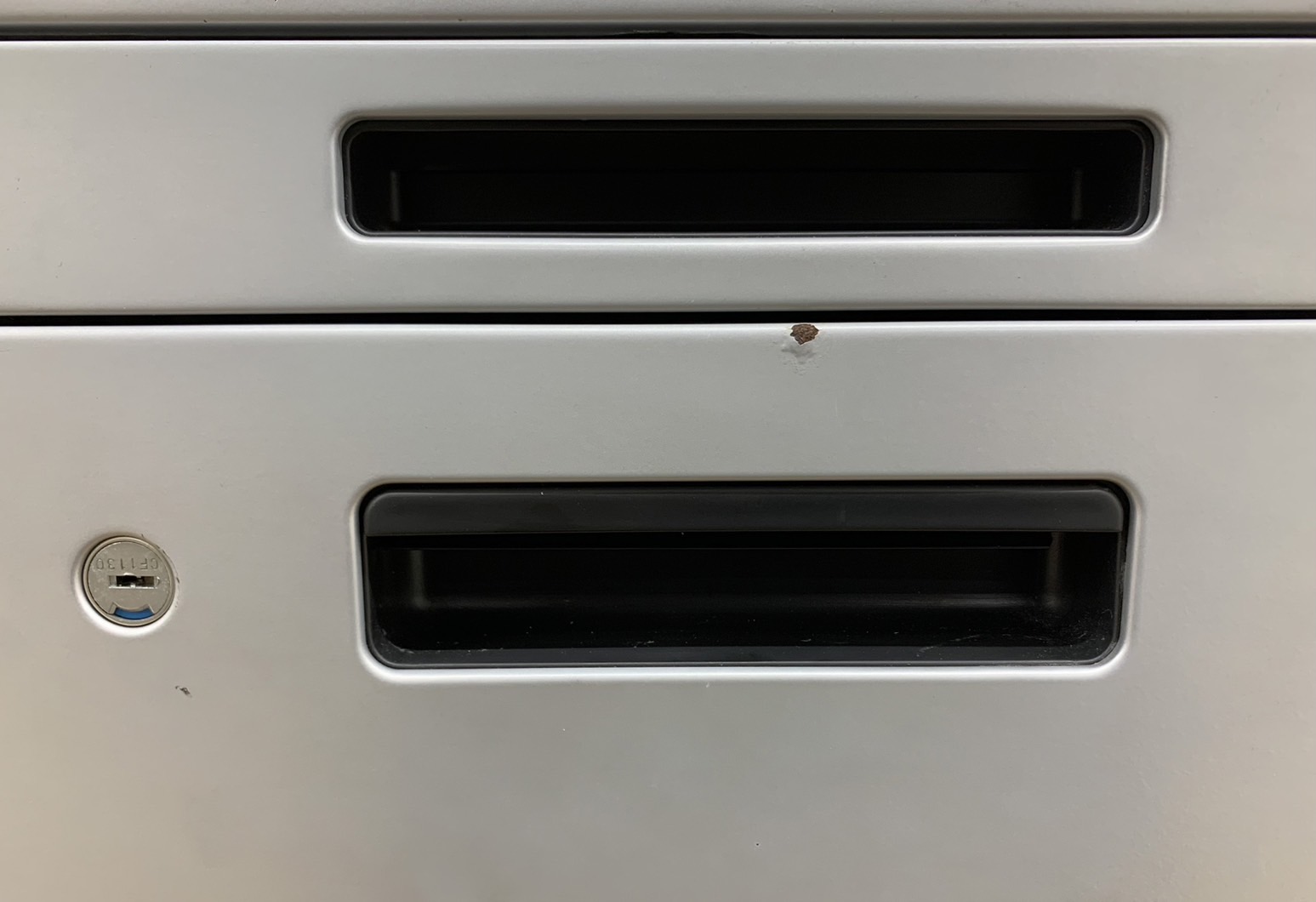 - 一部不具合ありその脇机・ワゴンの本来の効用を果たすための機能以外の一部が使用不可な状態。(例、引出が開閉しづらい、 キャスターロック機能使用不可、ラッチ不良 等がある。)