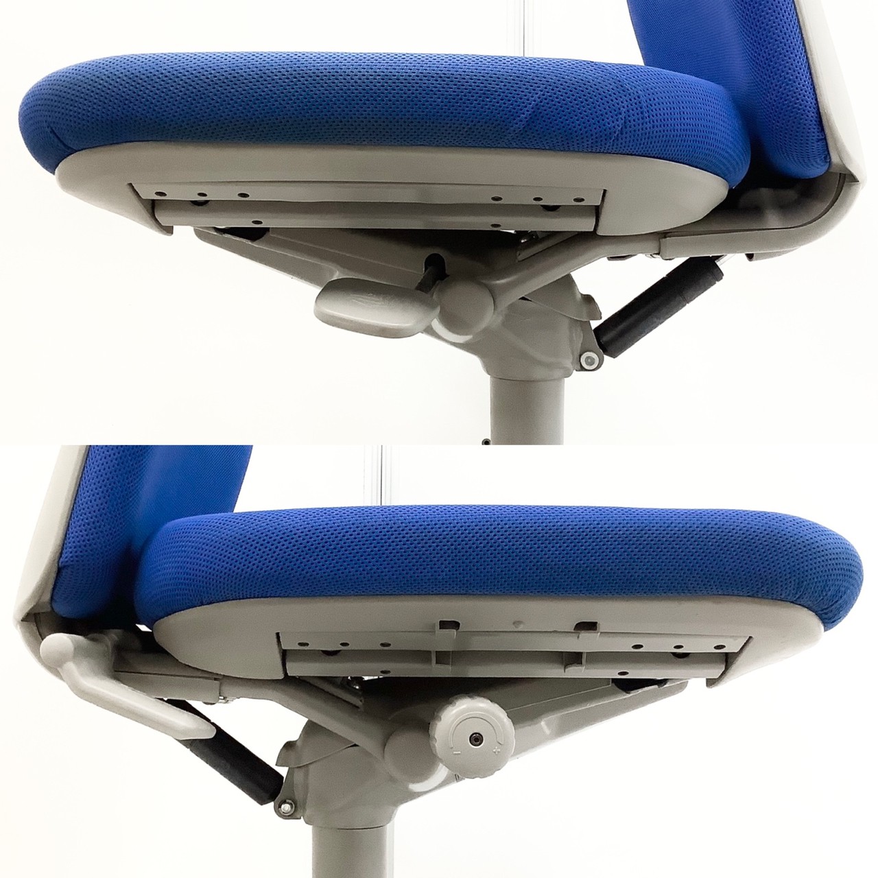 もう一つは、オカムラ社独自の""異硬度クッション""が座面に採用されていることです。これは座面が位置により異なる硬さのウレタンでできており、前方は腿裏を圧迫しないようソフトに、後方はしっかりと体重を支えるために少し硬めに作られています。クッション性とホールド感の両立により、長時間の作業での疲れを軽減してくれます。"