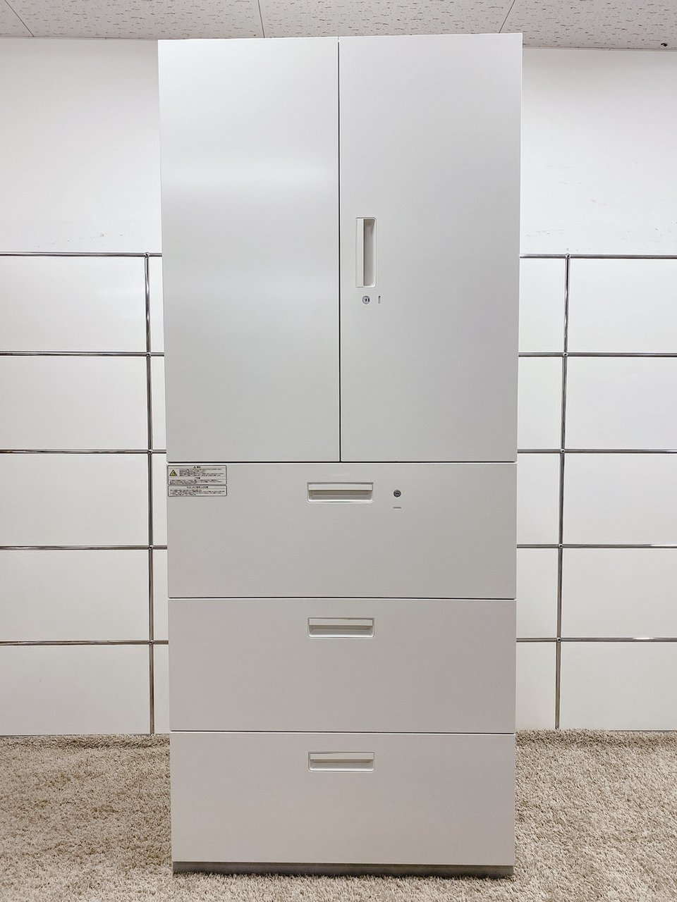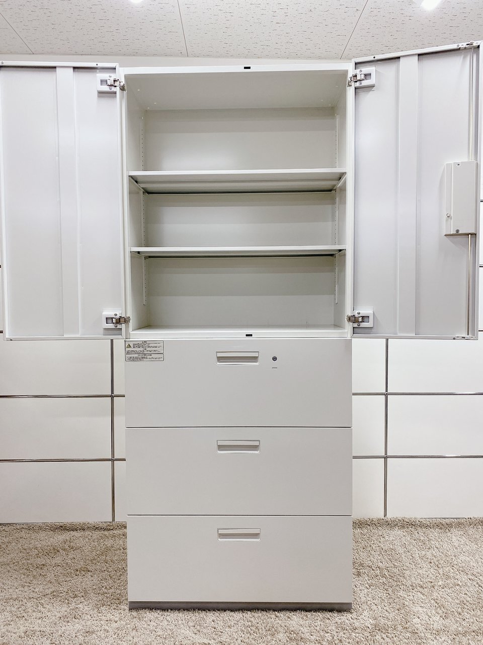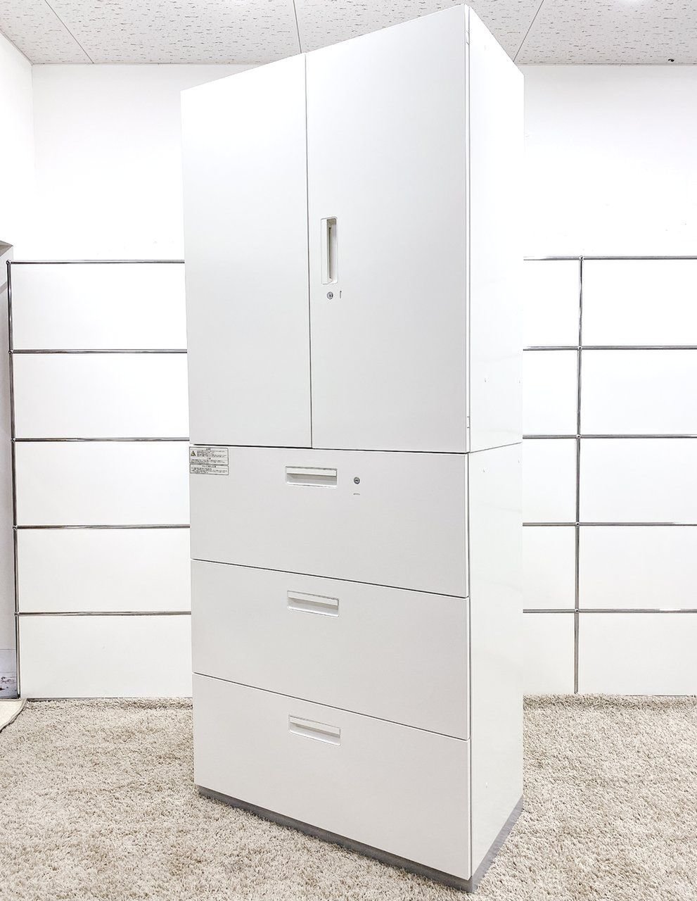 ★【T12】【商品入替のため、残り2台限り】プラス製 L6 ホワイト W900×D450×H2150 両開き+3段ラテラル シリンダー錠 オフィスの書類をスッキリ整理! 両開きと引き出し式の人気の組み合わせ! ハイキャビネット 上下書庫セット!!
