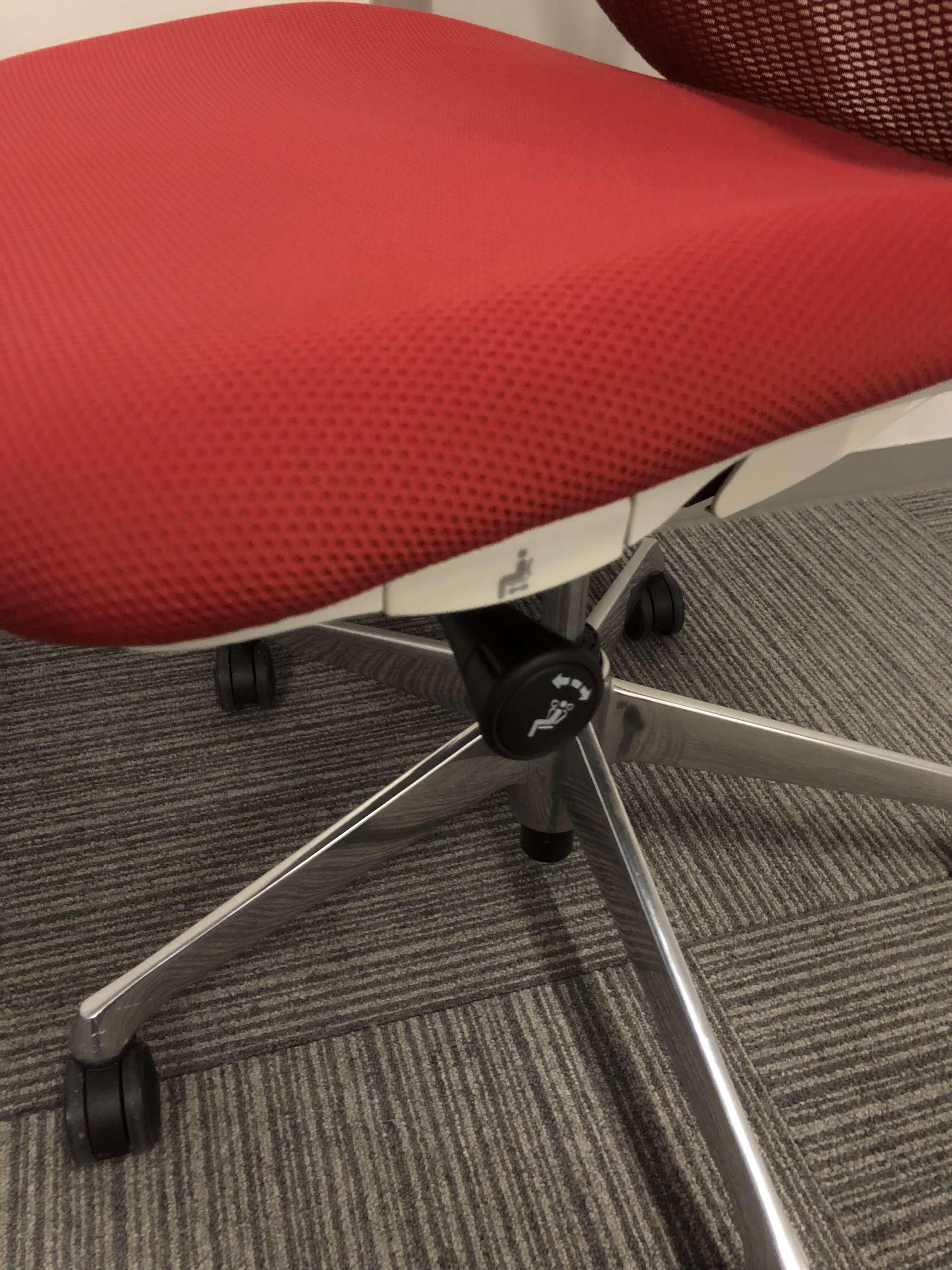 - 座面右下のダイヤル操作で、リクライニングの強弱調整が行えます。これまでのダイヤル式よりも、少ない回転数で、最弱?最強の調整が可能です。
