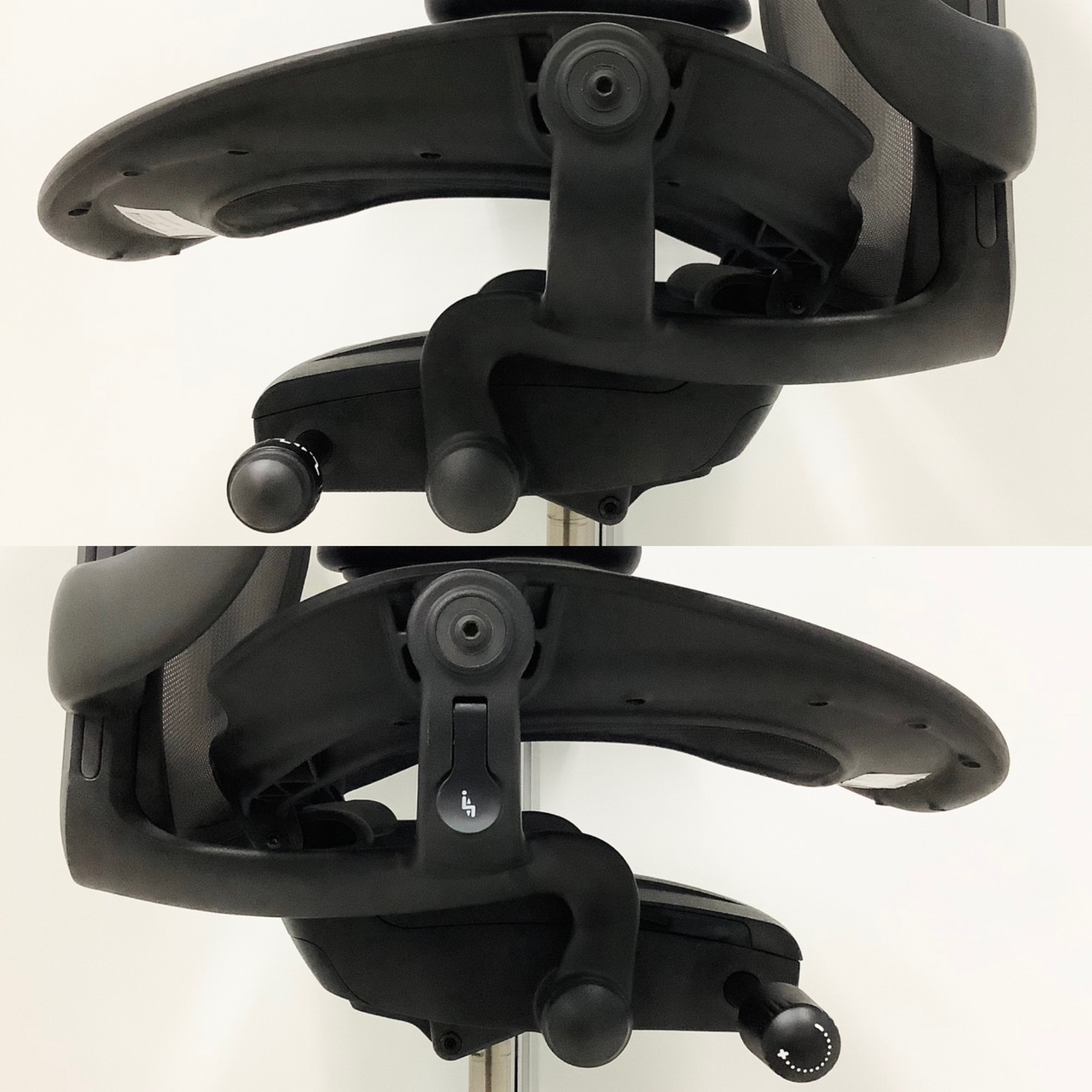 - 背もたれの裏にあるランバーサポート(パッド) の厚さは裏表で調節。上下の移動で、適切な高さ に調節できます。