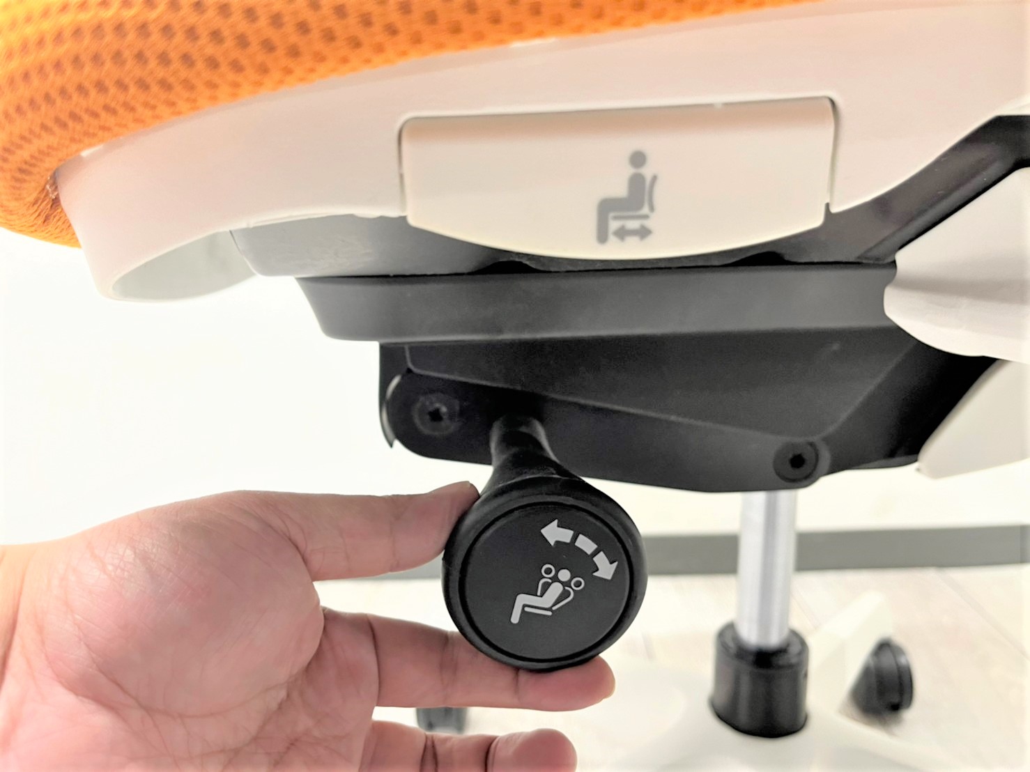 - 座面右下のダイヤル操作で、リクライニングの強弱調整が行えます。これまでのダイヤル式よりも、少ない回転数で、最弱?最強の調整が可能です。