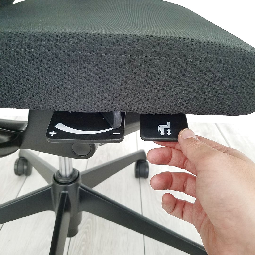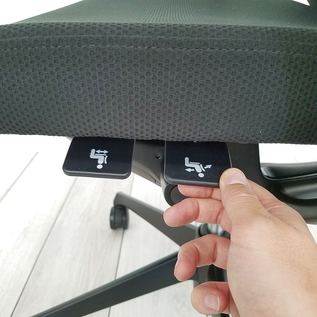 座面の高さや前後などの基本的な調整レバーが座面裏の前方に集約されており、姿勢を変えずに調節ができます。