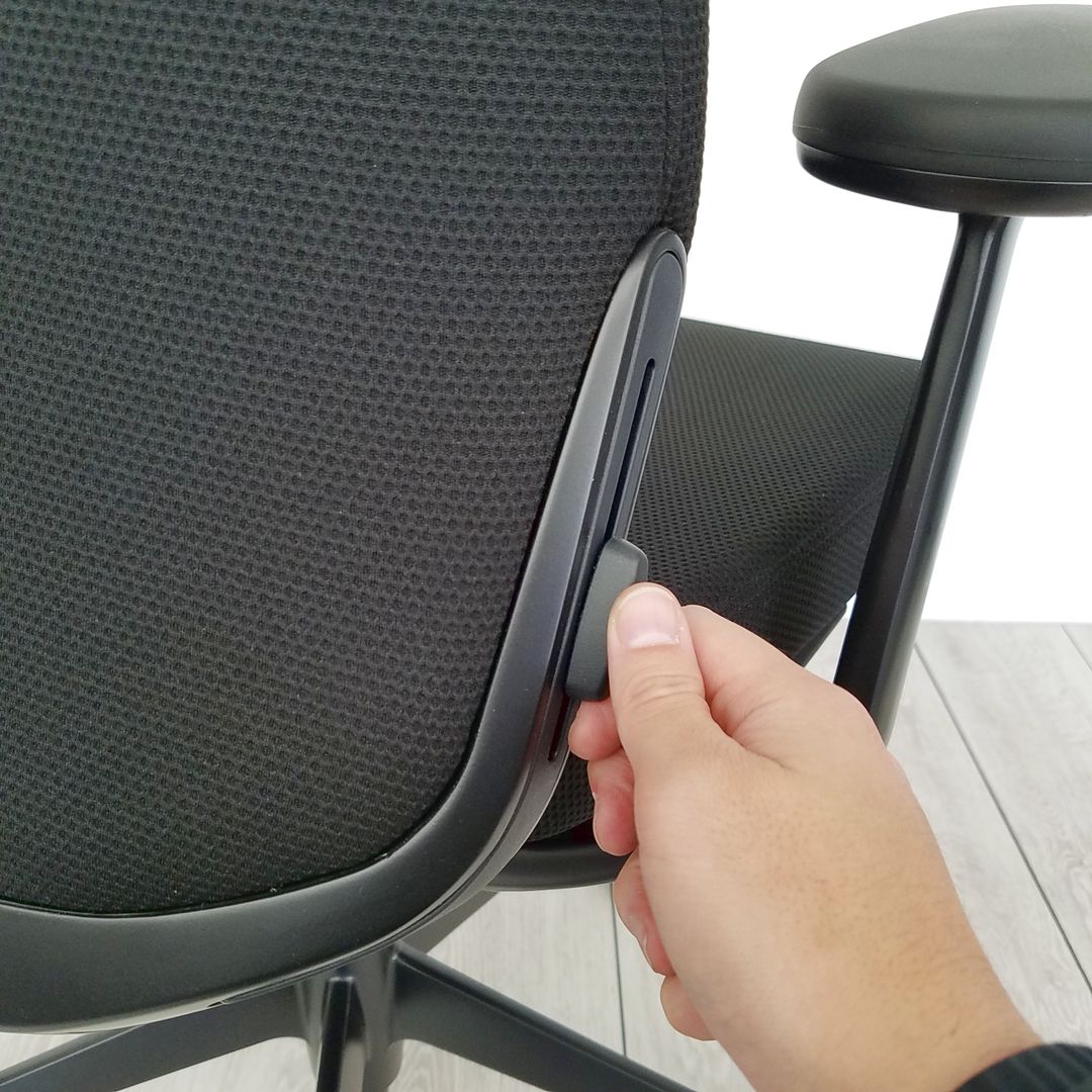 そしてこの調整レバーの中でも飛び抜けて便利なのが、""クイックスライドオペレーション""という背もたれのリクライニング反力調整のレバーです。多くのチェアではリクライニング反力調整のレバーはノブのような形になっており、かがんで座面の下に手を伸ばし、グルグルと回さなくては調節できず面倒なものでした。しかしコーラルではこれも座面裏にあり、座ったままレバーをスライドさせるだけで調節できるのです。この操作性をぜひ体感してみてください! "