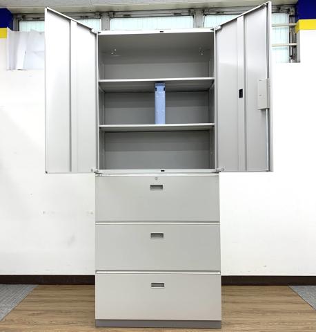 【倉庫在庫品】【これ1台で書類整理の問題が解決!上下で6段分の大容量収納!】■イトーキ (ITOKI)製 シンライン ハイキャビネット 両開き+3段ラテラル 書庫セット ■グレー ■シリンダー錠