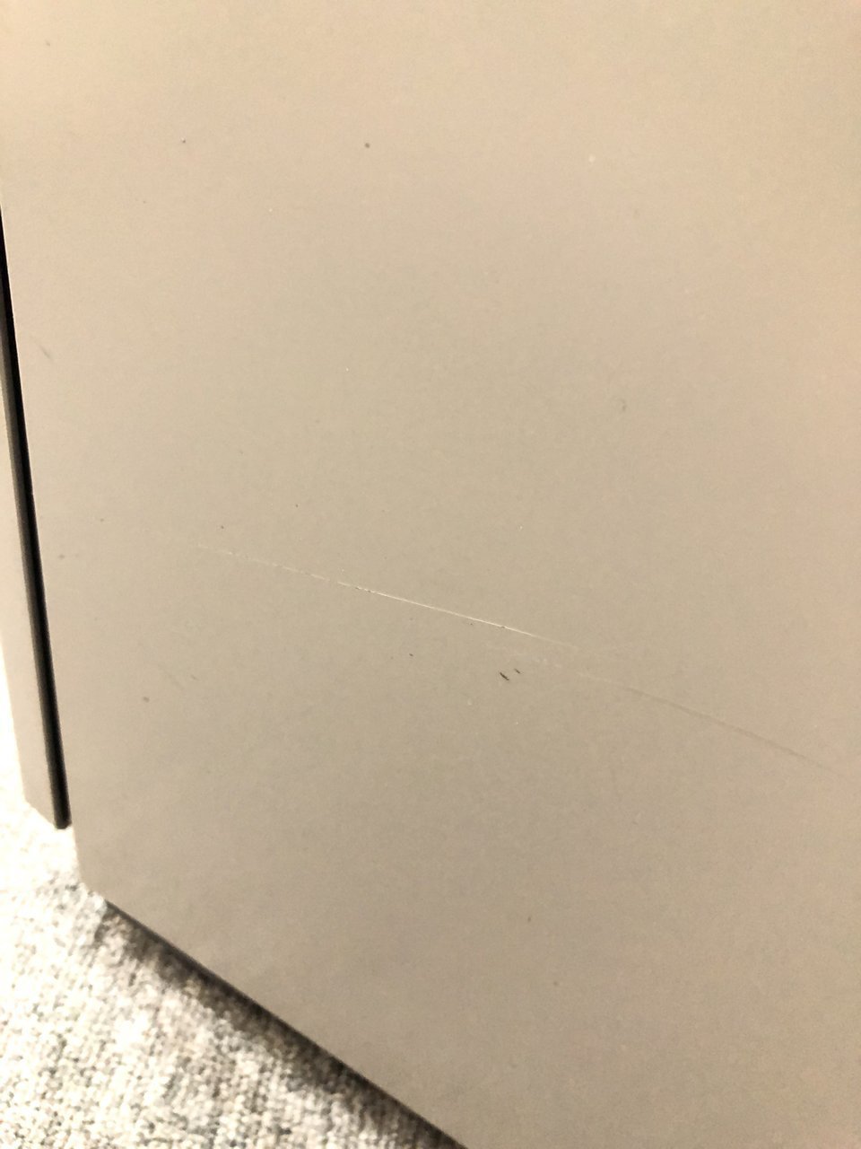 - 目立つ箇所あり傷・凹みが多数、深い傷・凹みが一部ある。(例、天板、正面、背後、サイド部分にある。)