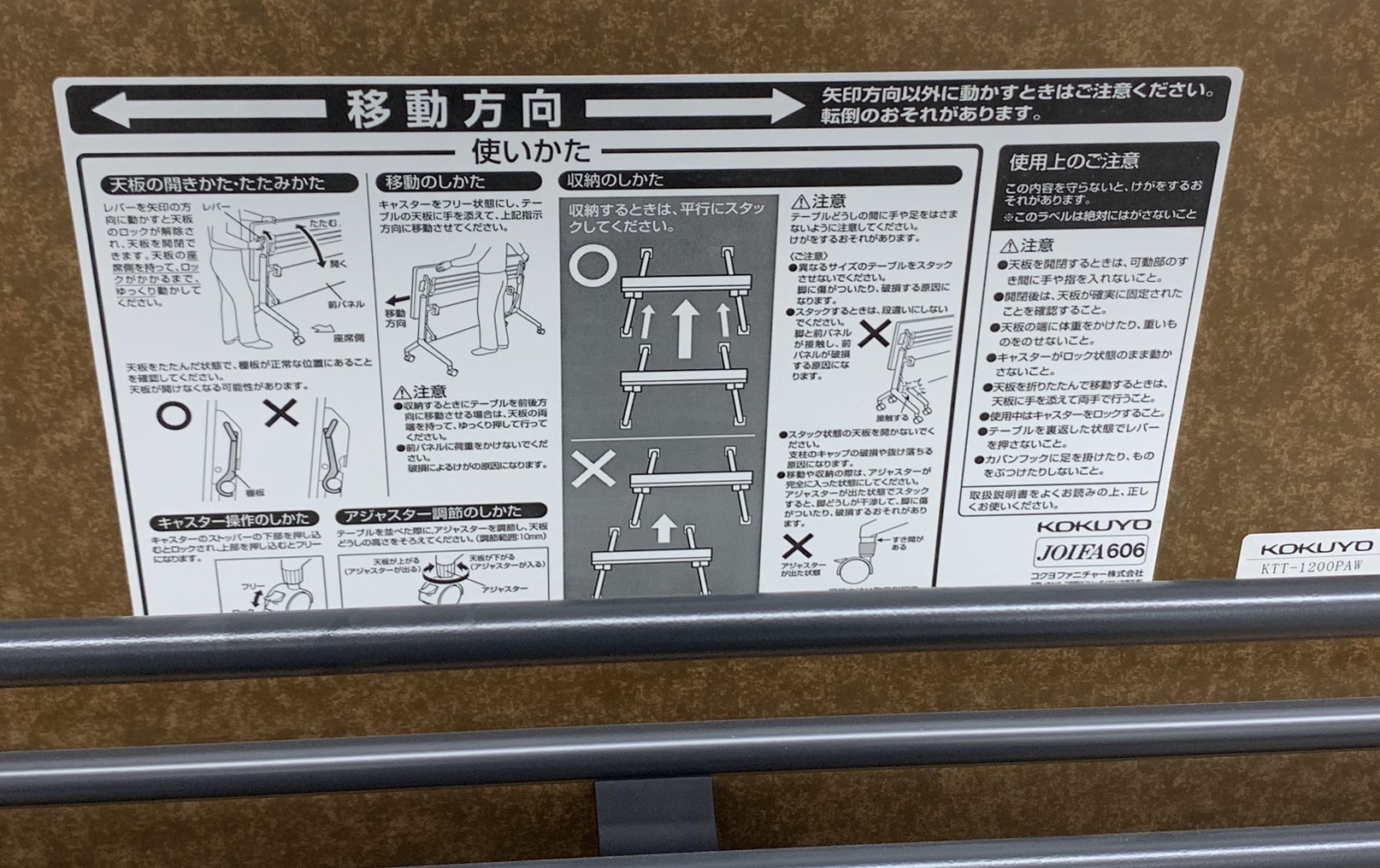 - 一部不具合あり天板歪み、アジャスター無し、キャスター使用不可ようなそのテーブルの本来の効用を果たすための機能以外の一部が使用不可な状態。(例、キャスターロッ ク機能使用不可、棚板無し等がある。)
