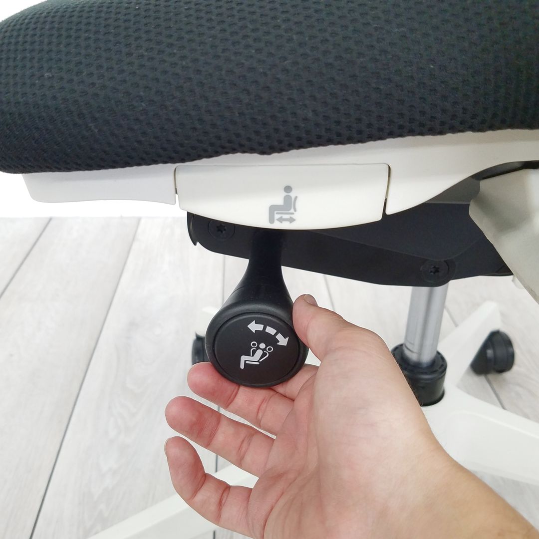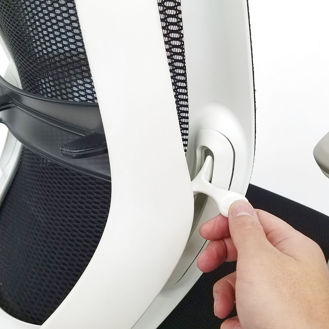 - 座面右下のダイヤル操作で、リクライニングの強弱調整が行えます。これまでのダイヤル式よりも、少ない回転数で、最弱?最強の調整が可能です。
